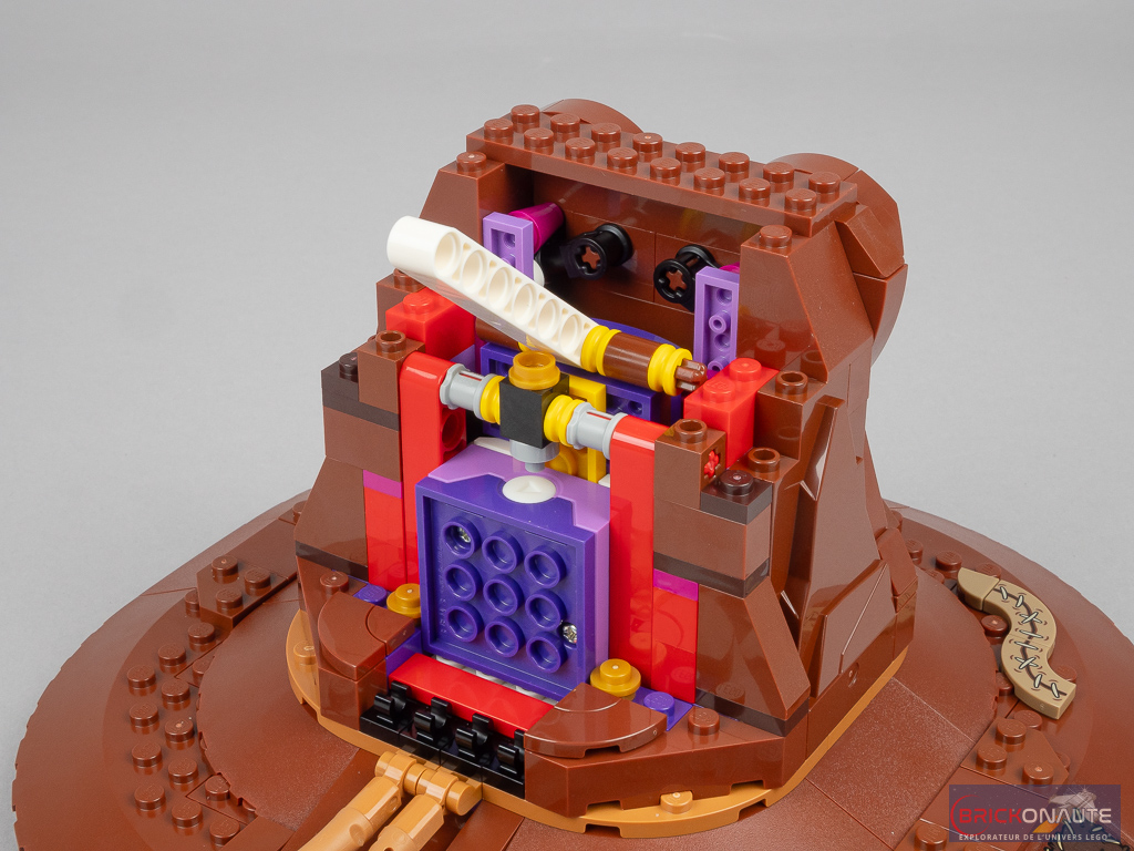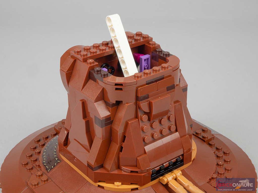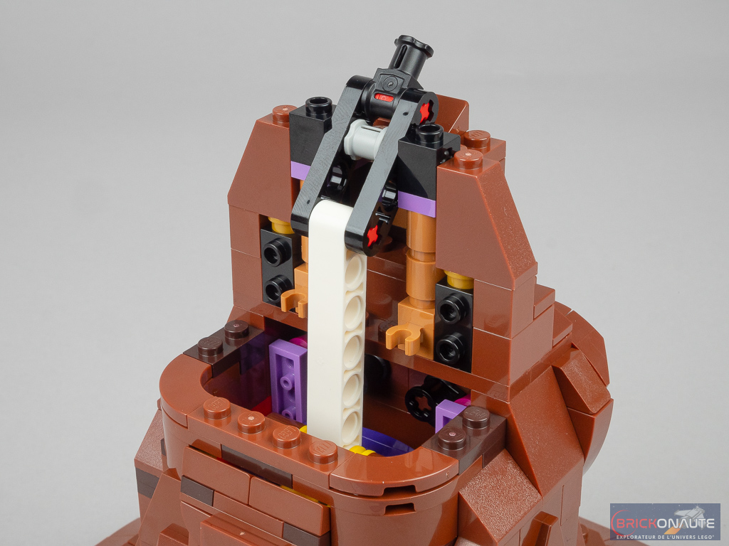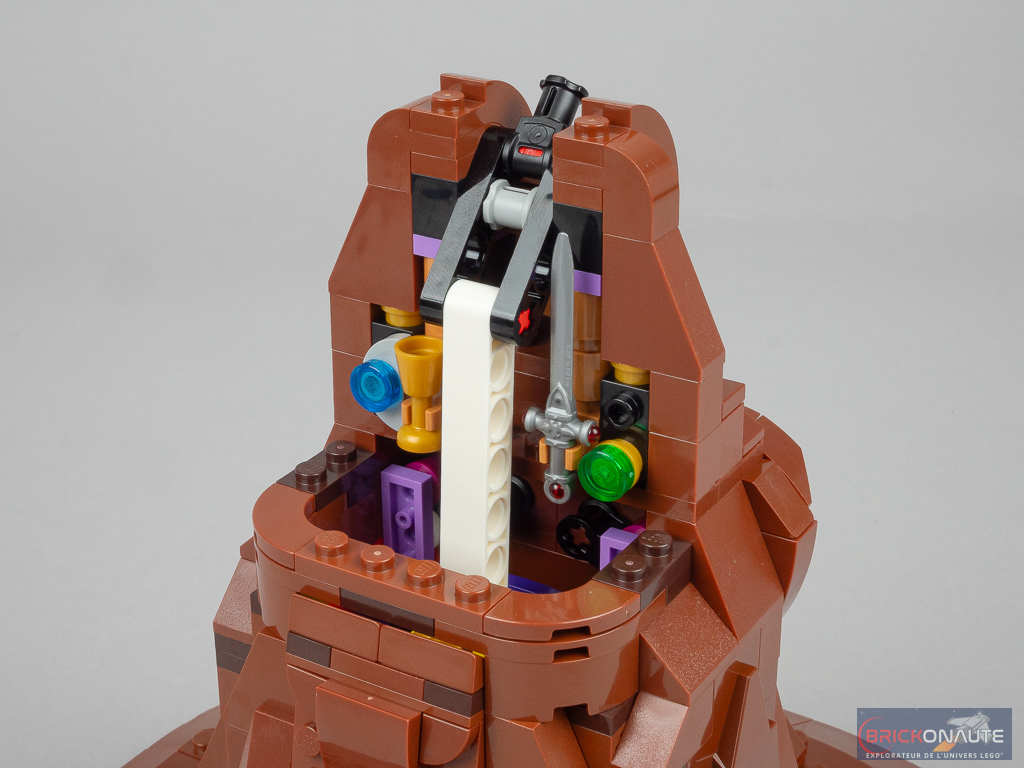 On termine la construction du mécanisme avec sa partie supérieure : un petit sous-ensemble Technic qui viendra tirer sur le beam pour activer l’ensemble. Côté intérieur, une petite surprise nous attend : on fixe les différentes reliques des fondateurs des maisons de Poudlard : l’épée de Godric Gryffondor, la coupe d’Helga Poufsouffle, le diadème de Rowena Serdaigle et le médaillon de Salazar Serpentard. On termine la construction avec un demi cône tronqué pour fermer l’arrière, quelques éléments SNOT pour habiller l’avant, et la pointe du chapeau qui vient s’attacher à la partie supérieure du mécanisme.