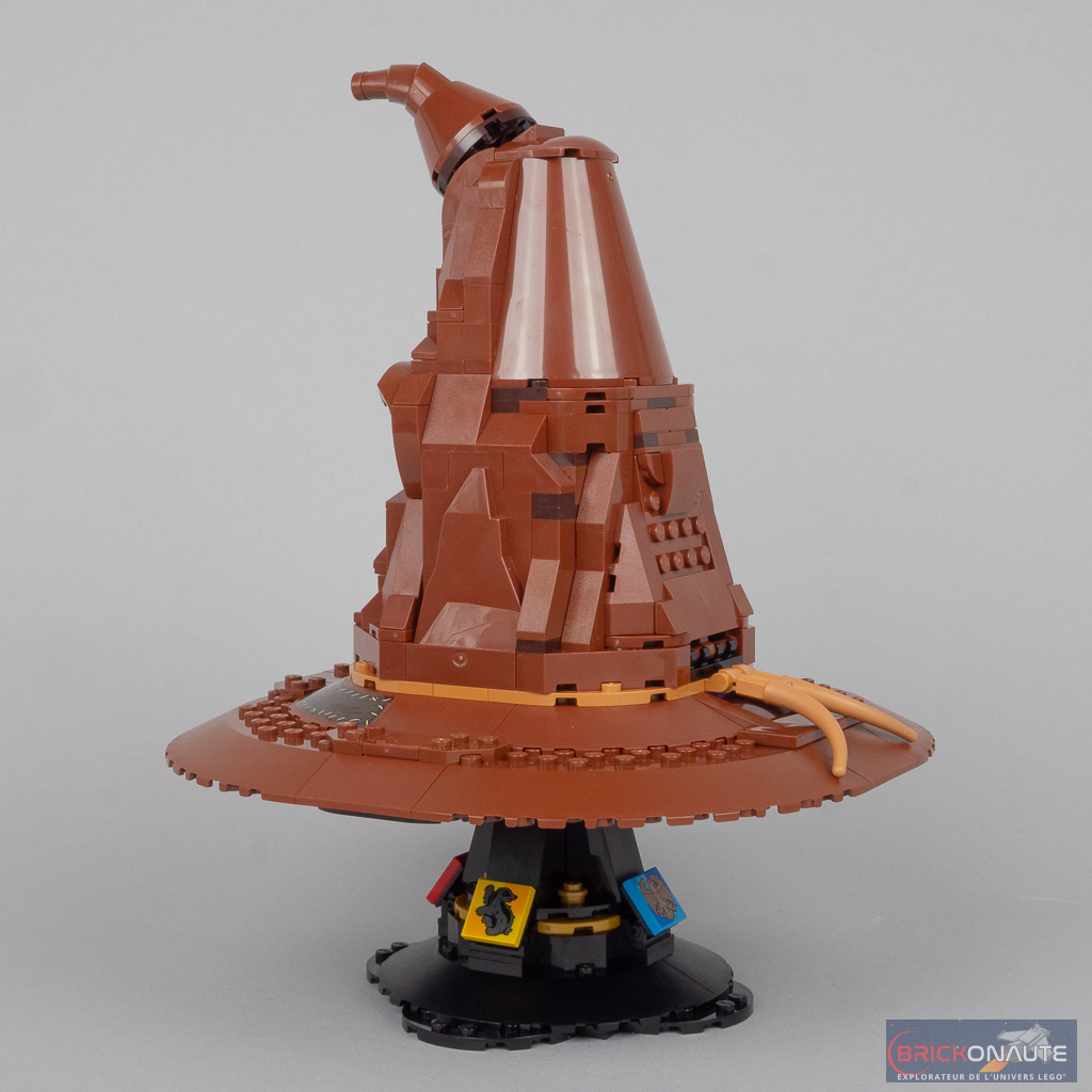 Toute la partie supérieure est plutôt bien réalisée et le « visage » retranscrit plutôt bien celui vu à l’écran, tenant compte de l’échelle retenue. Je suis en revanche bien moins convaincu par la partie basse qui ressemble vraiment à une assiette à l’envers. Le support est simple mais propre et permet de mettre le Choixpeau en valeur.