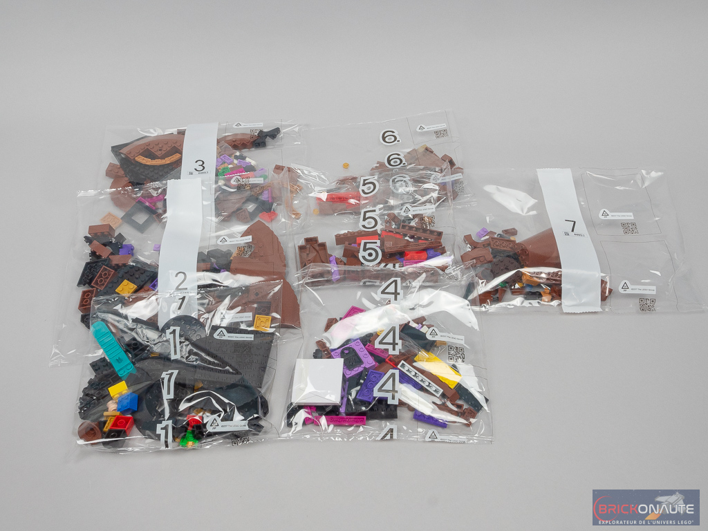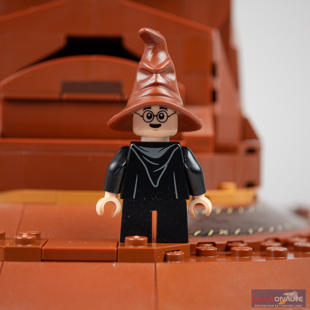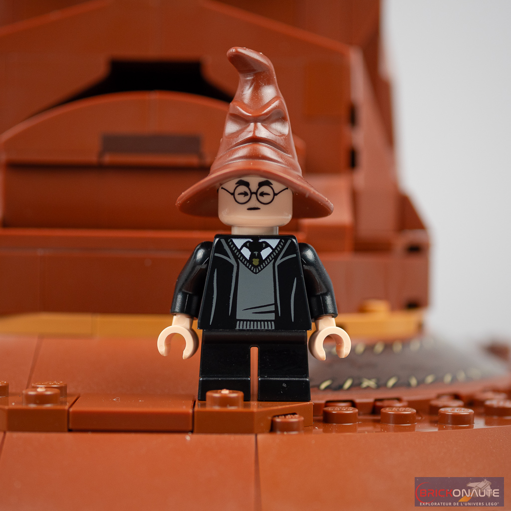Du côté des petits détails sympathiques on notera la possibilité de détacher facilement l’arrière du Choixpeau pour dévoiler les 4 reliques des fondateurs de Poudlard avec l’épée de Godric Gryffondor, la coupe d’Helga Poufsouffle, le diadème de Rowena Serdaigle et le médaillon de Salazar Serpentard. La minifig d’Harry Potter fournie propose un double visage inédit – avec les yeux fermés comme on le voit lors de la cérémonie de la Répartition.