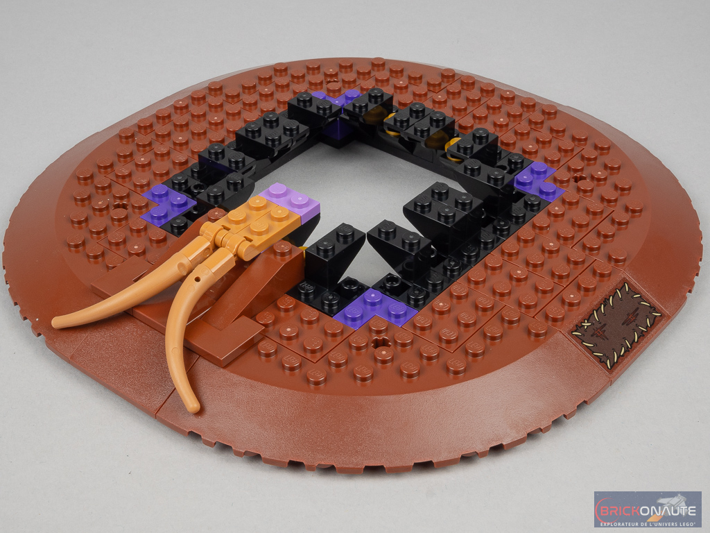 À l’intérieur de la boîte, on trouve 7 sachets de pièces numérotés, une notice d’instructions de 160 pages, et une petite planche de deux autocollants. Je ne vais pas revenir en détail sur l’inventaire qui, vous vous en doutez, contient une grande variété de pièces reddish brown. La « star » de cet inventaire est bien évidemment la brique sonore de 4×4 tenons. Un appui sur le petit bouton blanc « Lecture » déclenche un son. Il est possible d’ouvrir la brique pour changer les piles si nécessaire (3 piles bouton type LR44).