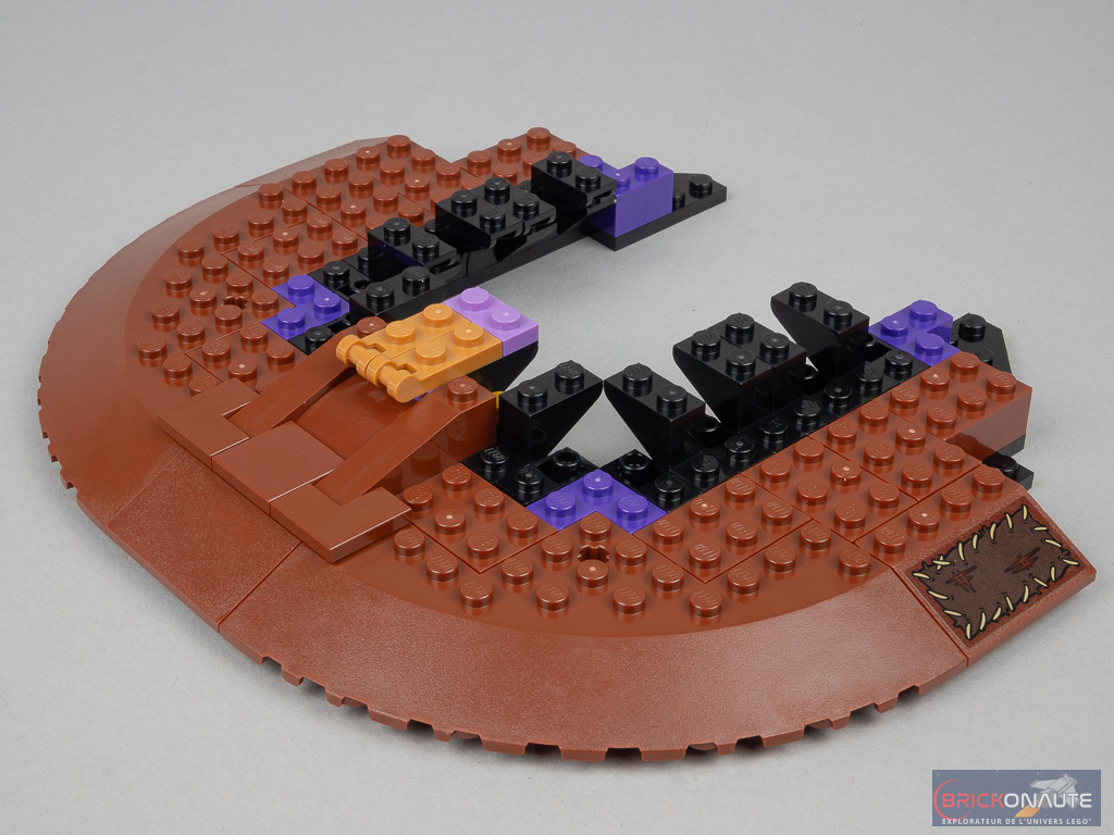On termine la construction du mécanisme avec sa partie supérieure : un petit sous-ensemble Technic qui viendra tirer sur le beam pour activer l’ensemble. Côté intérieur, une petite surprise nous attend : on fixe les différentes reliques des fondateurs des maisons de Poudlard : l’épée de Godric Gryffondor, la coupe d’Helga Poufsouffle, le diadème de Rowena Serdaigle et le médaillon de Salazar Serpentard. On termine la construction avec un demi cône tronqué pour fermer l’arrière, quelques éléments SNOT pour habiller l’avant, et la pointe du chapeau qui vient s’attacher à la partie supérieure du mécanisme.
