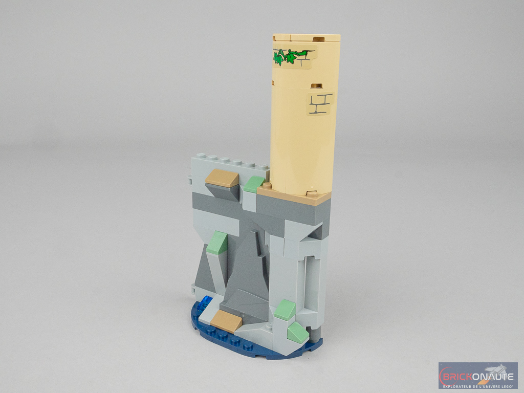 Côté design, c’est logiquement un peu « grossier » dans la conception. On assemble beaucoup de grands éléments et la construction finale manque du coup un peu de finesse dans les détails, avec ses gros morceaux de rocher, sa toiture trop raide et peu décorée, ou cette tour un peu trop lisse. Mais il faut malgré tout replacer ce set dans son contexte : un jouet pour enfant, prévu pour résister à des sessions de jeu prolongées et pour se connecter à d’autres morceaux du château. Je resterai donc indulgent dans ma note un peu plus bas : vu à une certaine distance, l’ensemble est finalement tout à fait convenable.