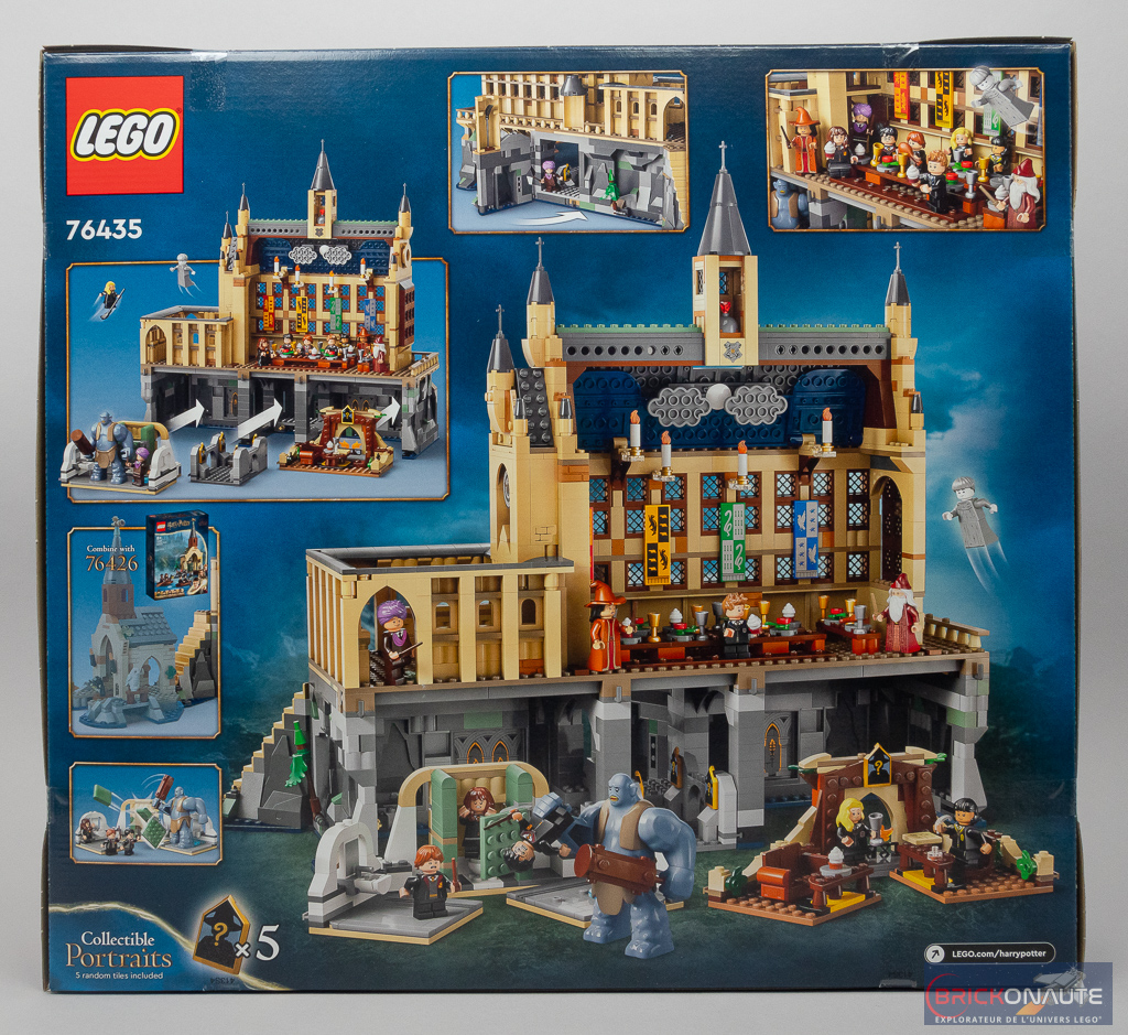 Sur la face avant de la boîte, la Grande Salle et la petite cour qui l’accompagne nous sont présentés de l’extérieur, posés sur une falaise. On y retrouve les différentes minifig dont le trio Harry, Ron et Hermione aux prises avec le troll des montagnes. Au dos, on découvre l’intérieur du set avec les 3 modules inférieurs sortis de leurs logements. Quelques vignettes insistent sur certains détails et fonctionnalités, on apprend également que cette boîte contient 5 portraits de Poudlard aléatoires à collectionner.
