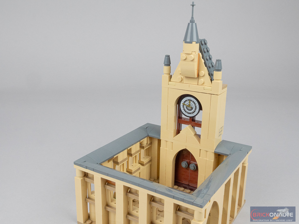 On continue avec la cour extérieure, avec sa porte d’accès à la Grande Salle. Cette cour est entourée de murs tan percés de deux accès pour les minifigs et de nombreux cadres de fenêtres. Au-dessus de la porte, un petit sous-assemblage forme une tour et une toiture (articulée sur des charnières) au milieu de laquelle on installe une horloge tampographiée.