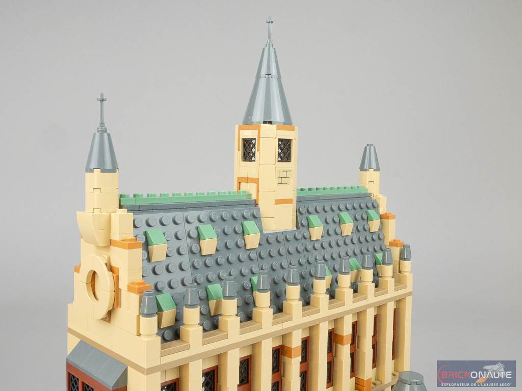On passe alors à la Grande Salle elle-même où on commence par installer 2 grandes tables, et une troisième plus petite, avant d’ériger les murs. La construction de ceux-ci est franchement répétitive et pas très intéressante dans sa conception, même si le résultat final est plutôt correct et c’est bien ce qui compte. La toiture est articulée sur des pins Technic et on y attache deux nuages sur des charnières. Les deux pignons et une grande structure centrale surmontée d’une tour permettent de la placer avec l’angle souhaité. Côté intérieur, on ajoute quelques victuailles et plusieurs coupes sur les tables, les drapeaux des 4 maisons au mur, et quelques bougies flottantes.
