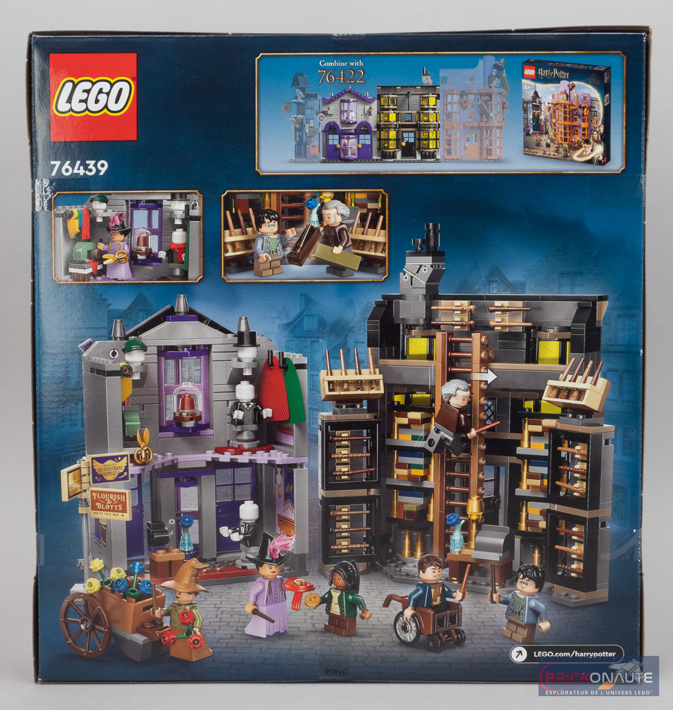 Sur la face avant de la boîte, on découvre les façades des deux bâtiments et les minifigs vaquant à leurs occupations. Au dos, On en découvre l’intérieur ainsi que 2 photos de détail. Un panorama nous montre la possibilité de combiner le set avec la référence 76422 Diagon Alley: Weasley’s Wizard Wheezes pour former une plus grande portion du chemin de Traverse.