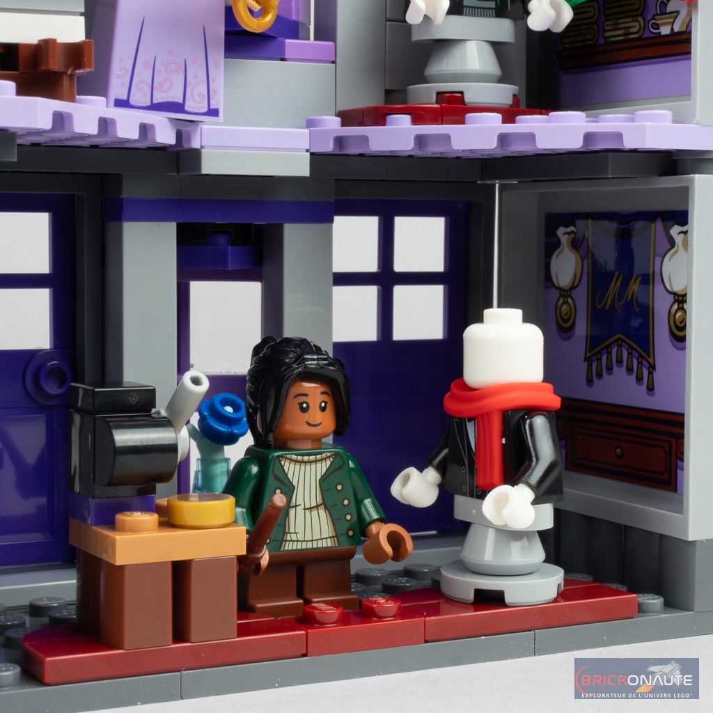 La construction est globalement sympathique avec quelques « techniques » sympa dans la réalisation des fenêtres ou des étagères chez Ollivander – il faudra par contre s’accommoder de grands autocollants, pas spécialement faciles à appliquer surtout dans les grands panels de la boutique de vêtements. Et si la boîte est dédiée à un jeune public (8+), il faudra peut-être leur prêter main forte.