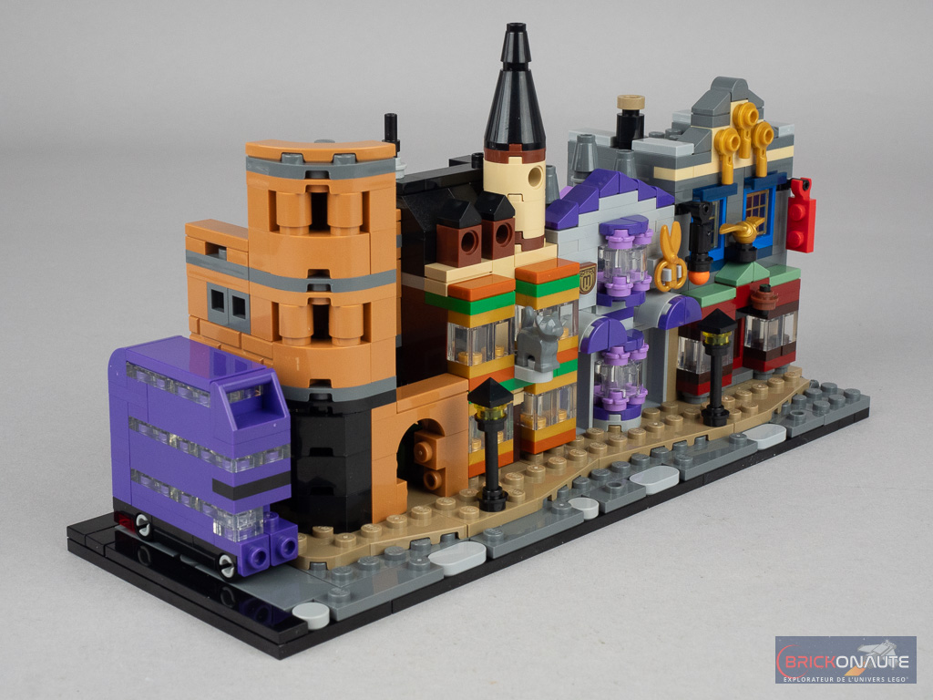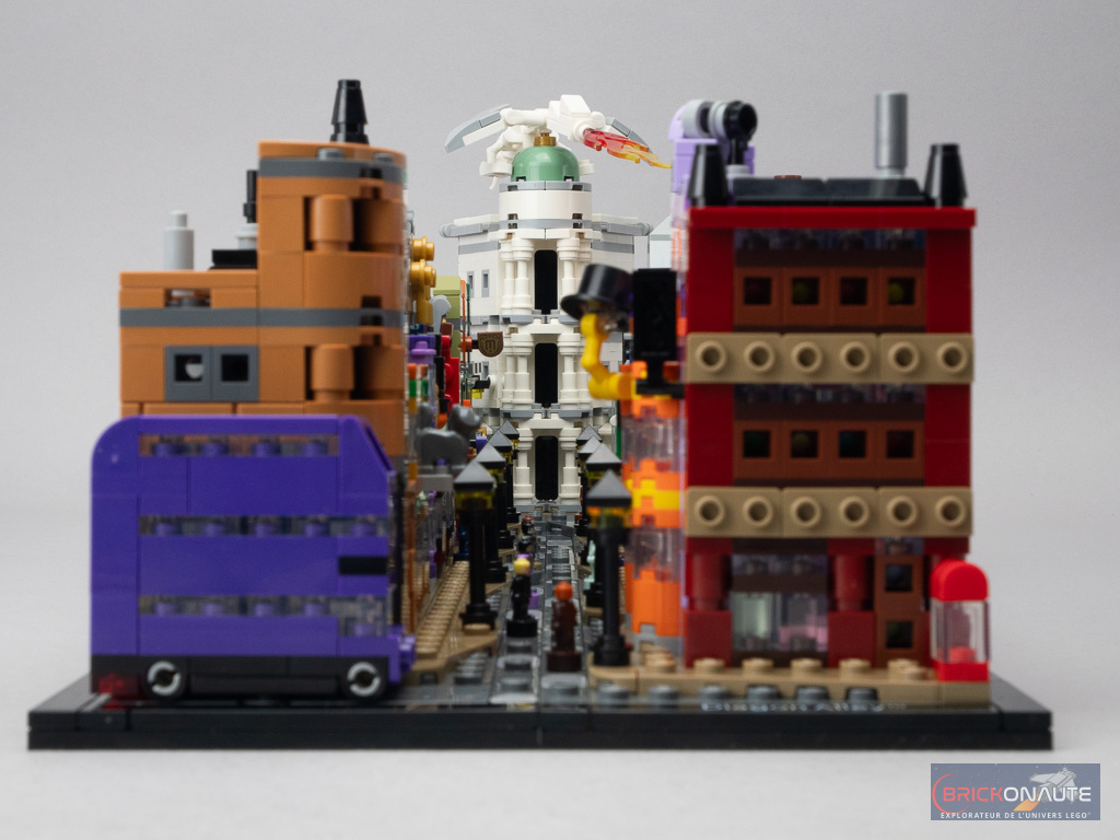 Si je ne me suis pas spécialement amusé pendant la construction, le temps passé en vaut néanmoins la chandelle : le modèle terminé est plutôt réussi et on identifie facilement les différents bâtiments car même à cette échelle, le designer est parvenu à conserver ce qui fait l’essence de chacun d’eux, dans les formes et les couleurs. Dommage cependant que le designer n’ait pas trouvé le moyen de mettre les colonnes de Gringotts de travers, c’est quand même ce qui caractérise le mieux ce bâtiment.