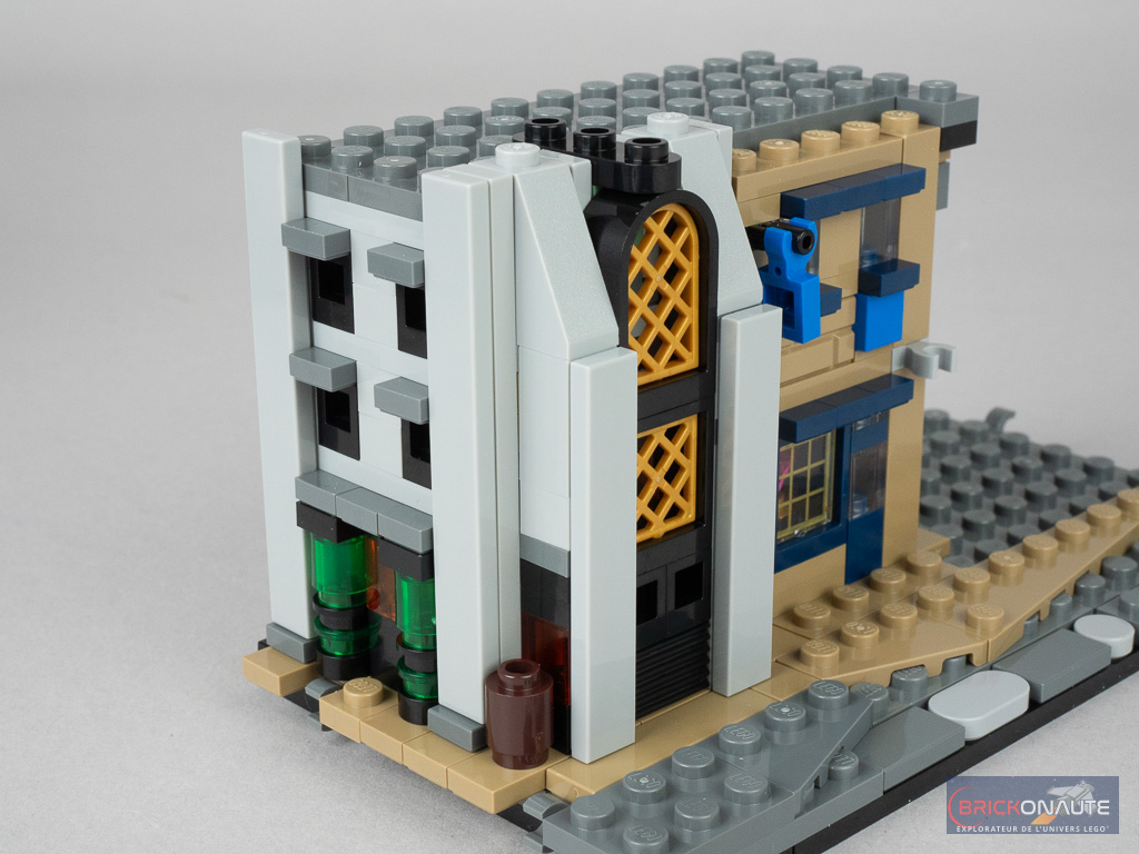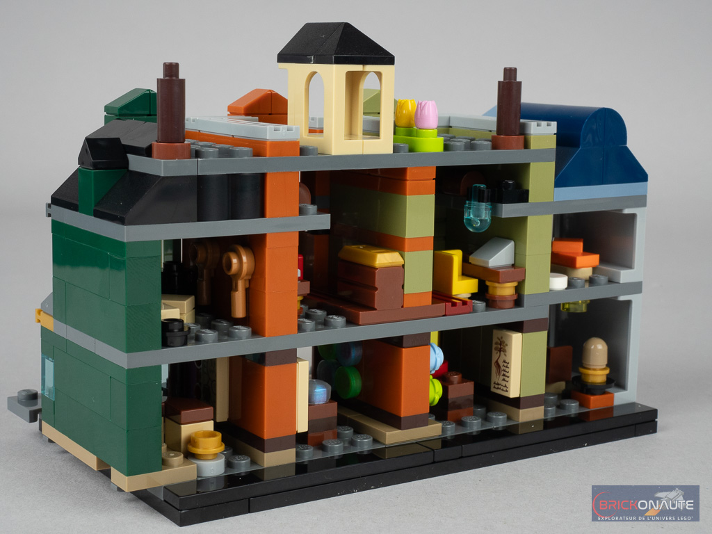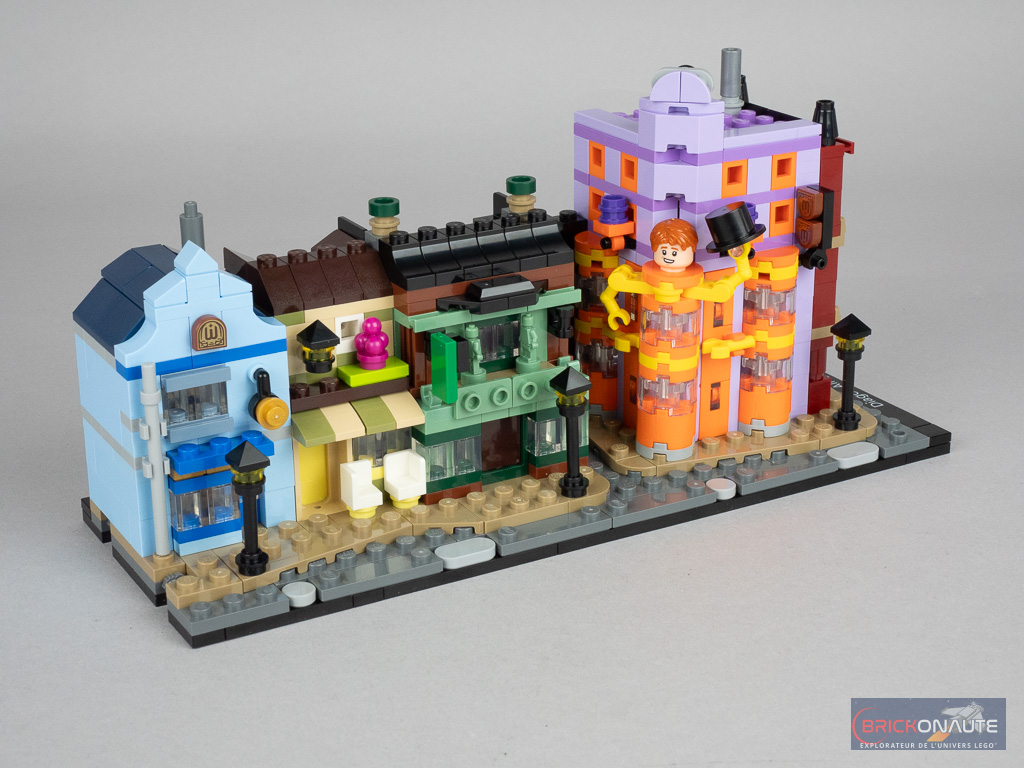 C’est la première fois chez LEGO qu’un Chemin de Traverse aussi complet nous est proposé, avec pas moins de 16 lieux différents. Il en résulte une construction de 88 cm de long si vous décidez d’accoler toutes les façades, soit presque autant que le gros set 75978 Diagon Alley (5544 pièces – 449,99 €) sorti en 2020 et toujours vendu par LEGO, mesurant 102 cm de long. Donc même s’il s’agit d’une construction microscale, prévoyez tout de même un peu de place pour l’exposer.