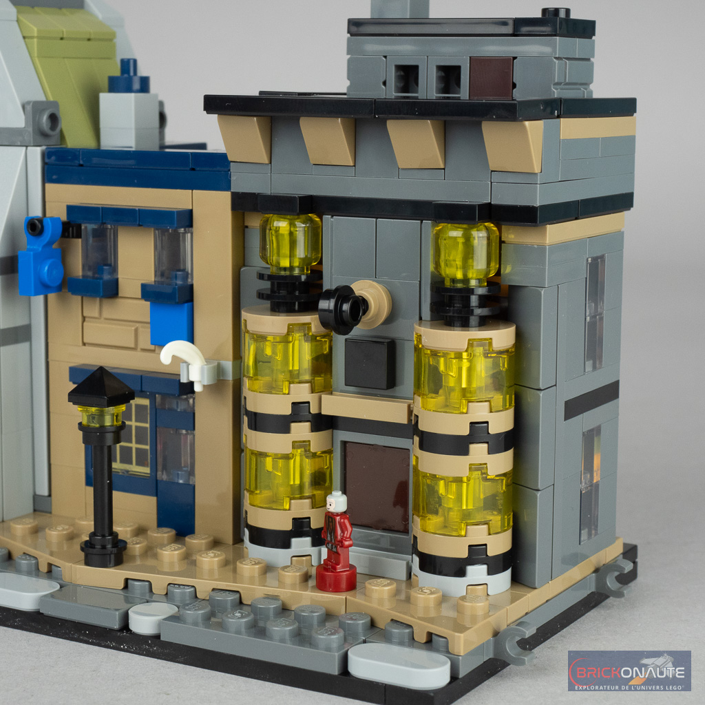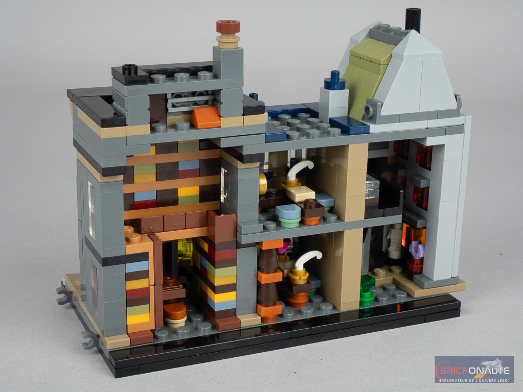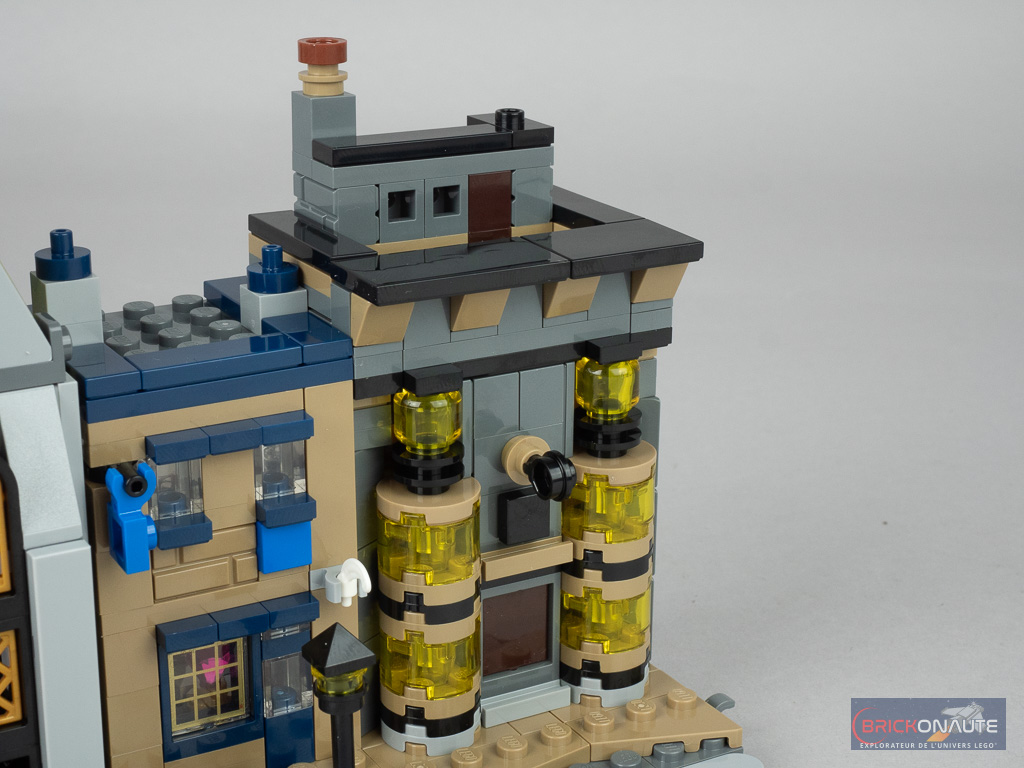 Si la plupart des bâtiments se ressemblent beaucoup, deux d’entre eux proposent une conception plus intéressante que les autres. Pour la banque Gringotts, on remarquera le système astucieux pour trouver l’angle désiré entre les murs principaux, le tout étant « sécurisé » par la suite avec des charnières. Pour la boutique des jumeaux Weasley, j’ai beaucoup aimé la manière de réaliser les grands escaliers intérieurs.