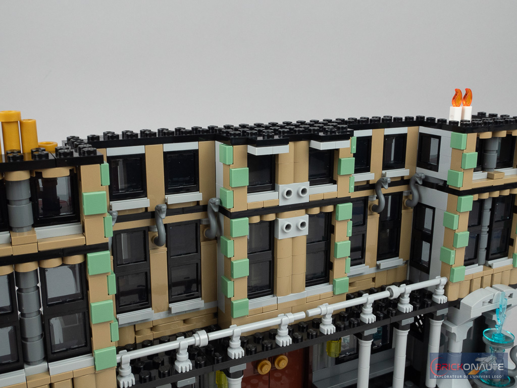 Les couleurs du manoir sont difficilement identifiables dans les images très sombres du film mais celles qui sont choisies ici pourraient tout à fait correspondre à l’idée qu’on s’en ferait. Le niveau de détail extérieur avec ses colonnes, la maçonnerie ou les grands balcons est tout à fait satisfaisant. J’aime beaucoup également la petite fontaine et la statue intégrés dans les soubassements.