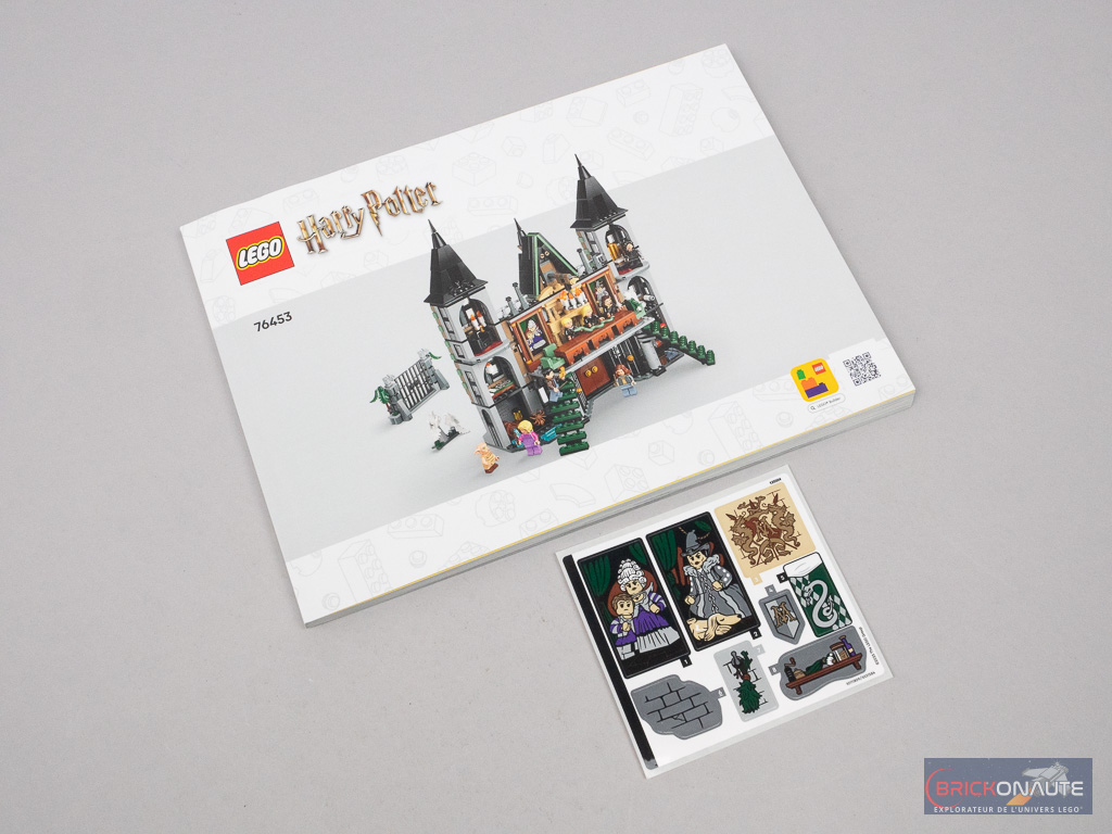 Rien de particulier à mentionner concernant la boîte : elle nous présente la façade du manoir sur sa face avant, et l’intérieur sur l’arrière accompagné de quelques vignettes de détail. Elle contient 13 sachets de pièces numérotés, une notice d’instructions de 308 pages et une planche de 8 autocollants.