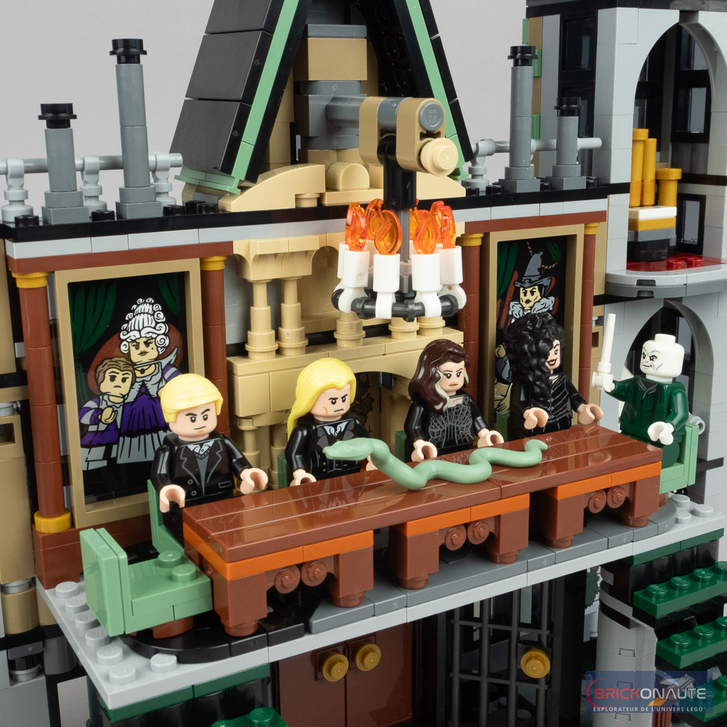 On ajoute une rangée de fenêtres sur la partie centrale du bâtiment et on termine le mur de la salle principale avec deux grands cadres ornés d’autocollants. Côté intérieur, on installe une grande table pour les Mangemorts et 6 fauteuils pour que les grands méchants puissent se rassembler. On agrandit encore d’un niveau les tours latérales, on ajoute le lustre avec un système permettant de le faire tomber, et on termine par les différentes toitures. Au centre, ce sont des sous-assemblages fixés sur des clips qui permettent de trouver l’angle voulu, sur les côtés c’est une simple superposition de grandes slopes.
