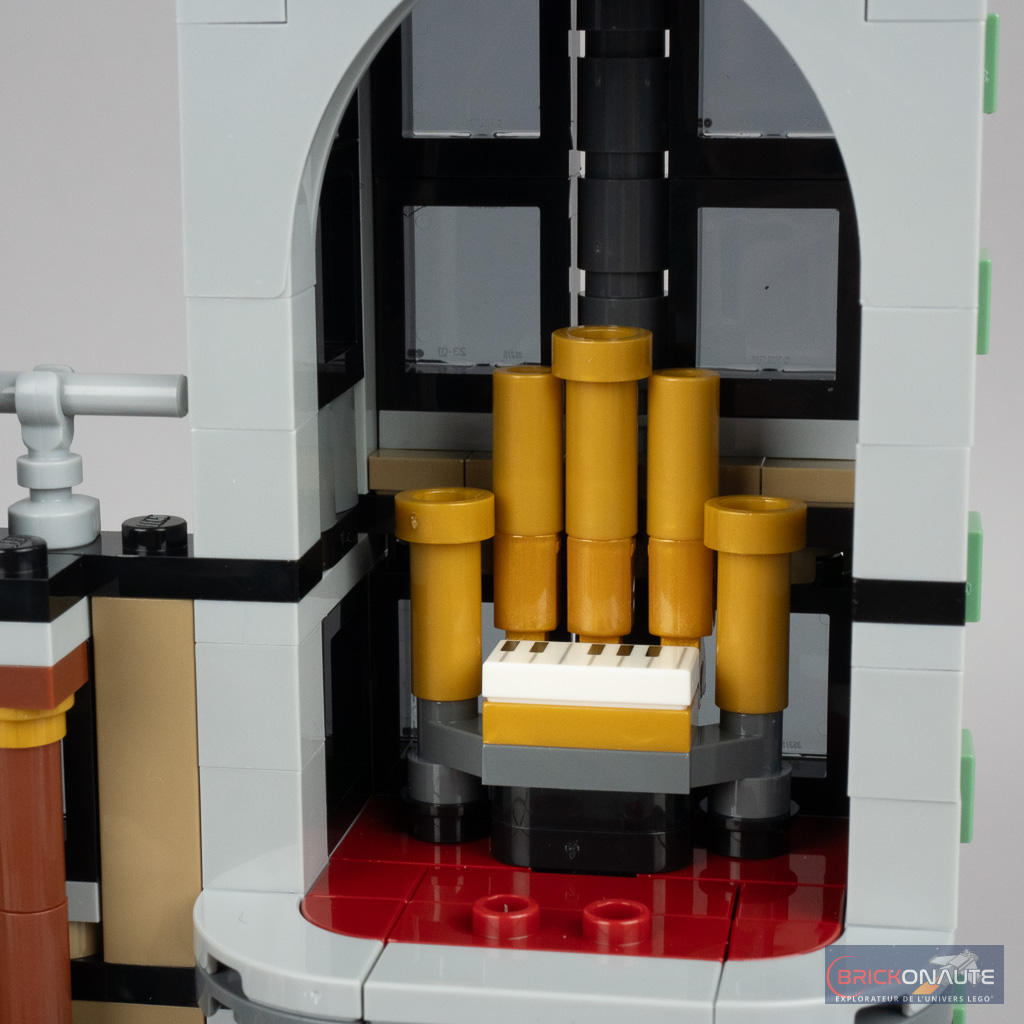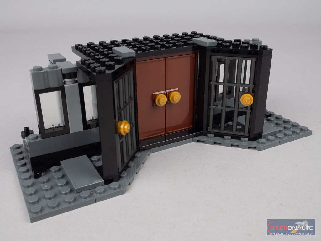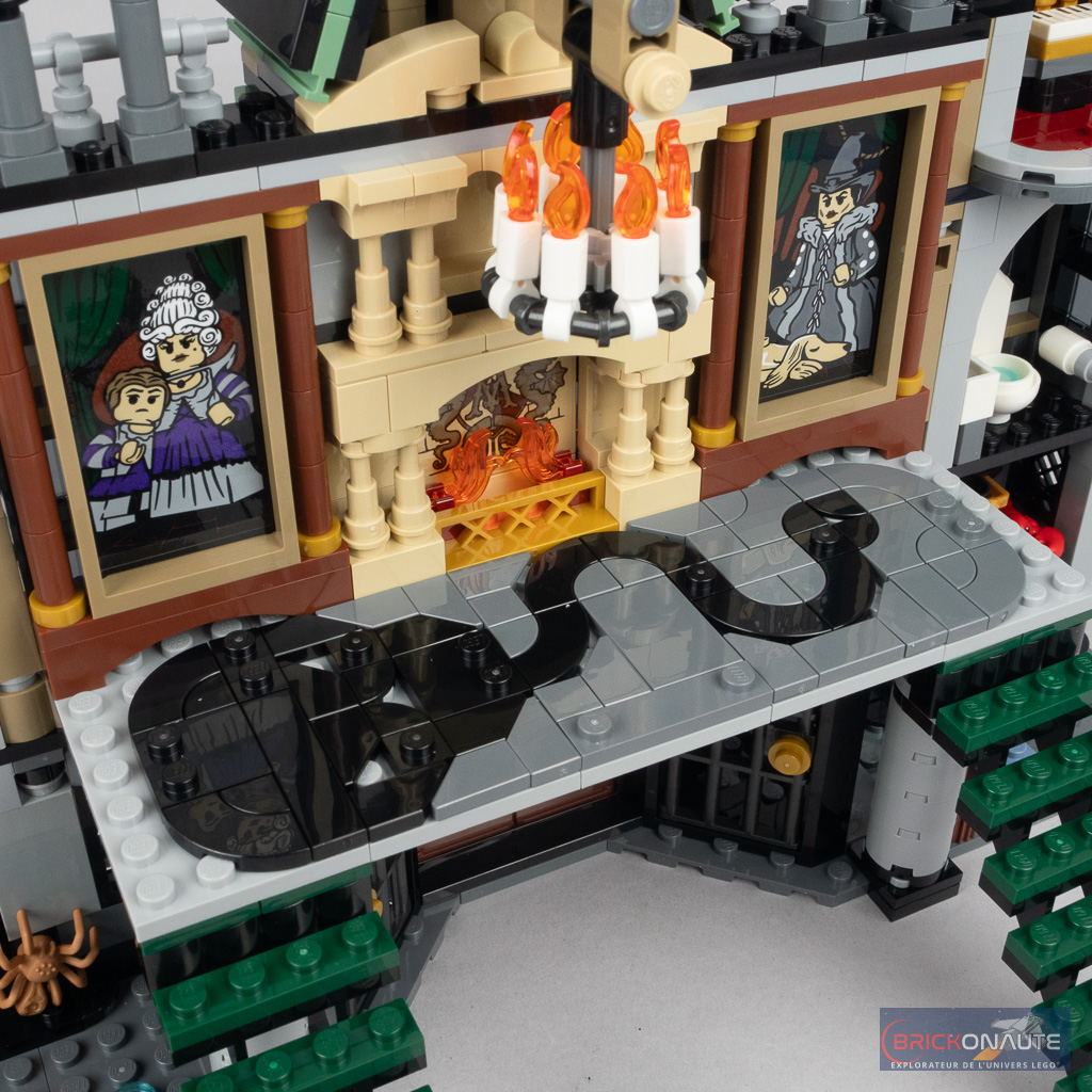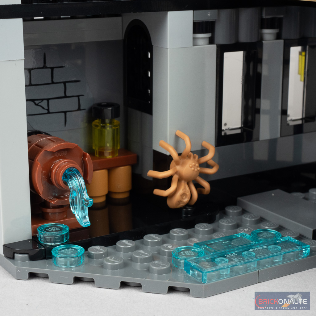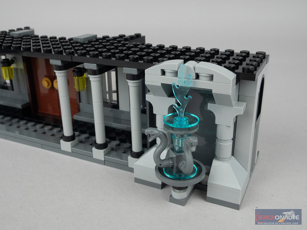 Deux petites « fonctionnalités » sont à mentionner. La première permet, en retirant un axe Technic, de faire tomber le lustre comme Dobby et permettre ainsi à Hermione de s’échapper des griffes de Bellatrix Lestrange. La seconde est plus « pratique » : les deux escaliers menant à la salle principale sont rotatifs et libèrent donc l’accès aux zones situées derrière eux une fois déployés. Repliés, il permettent de réduire la profondeur de la construction.