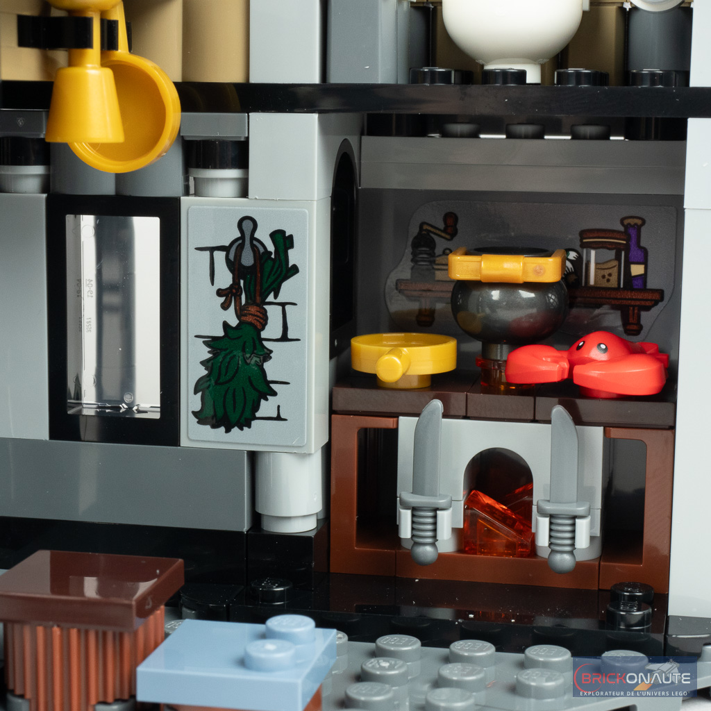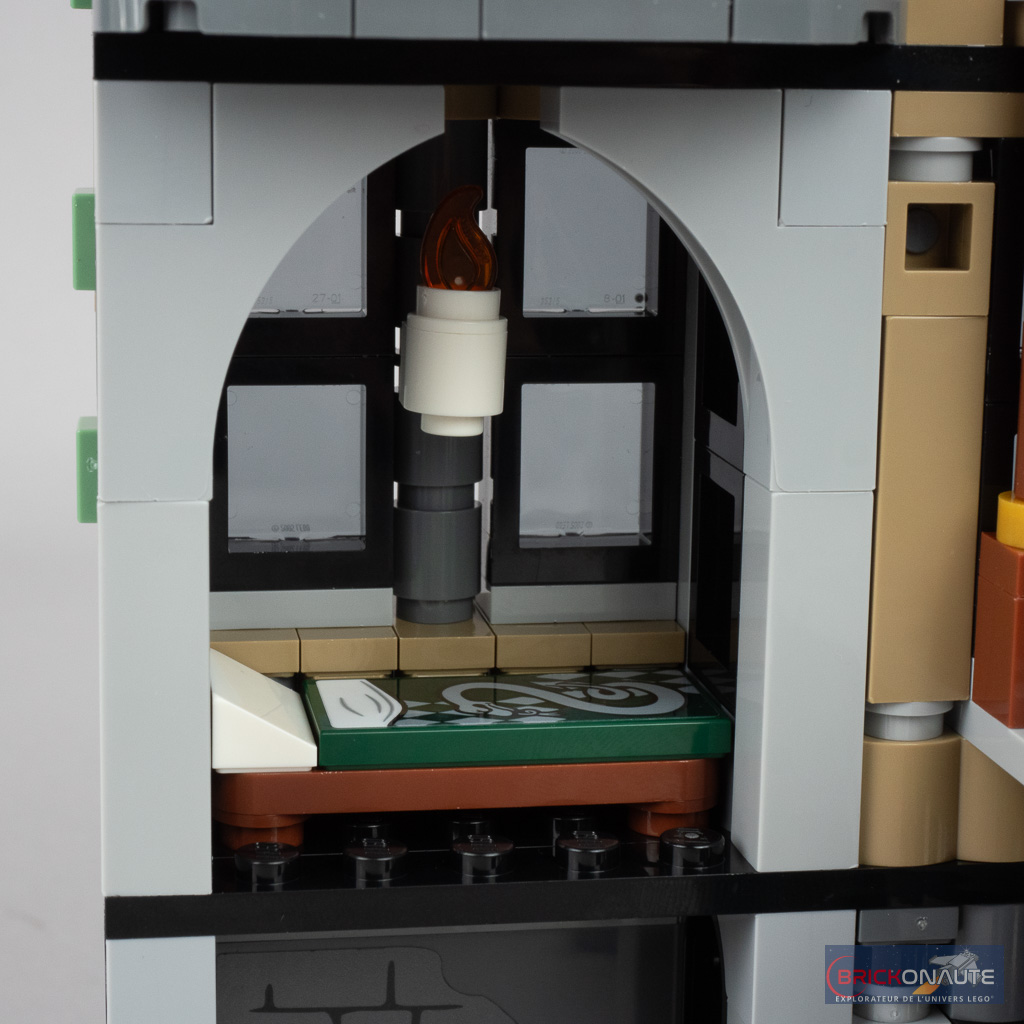 Côté intérieur, on ne dispose que d’un seul véritable espace « jouable » avec la grande salle et son immense table pour y placer les Mangemorts. La finition est impeccable avec une cheminée joliment travaillée flanquée de deux grands tableaux et des pieds de table ouvragés. La table et les fauteuils sont prévus pour se démonter facilement et laisser apparaître le joli travail du sol avec la Marque des Ténèbres.
