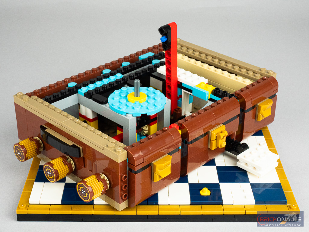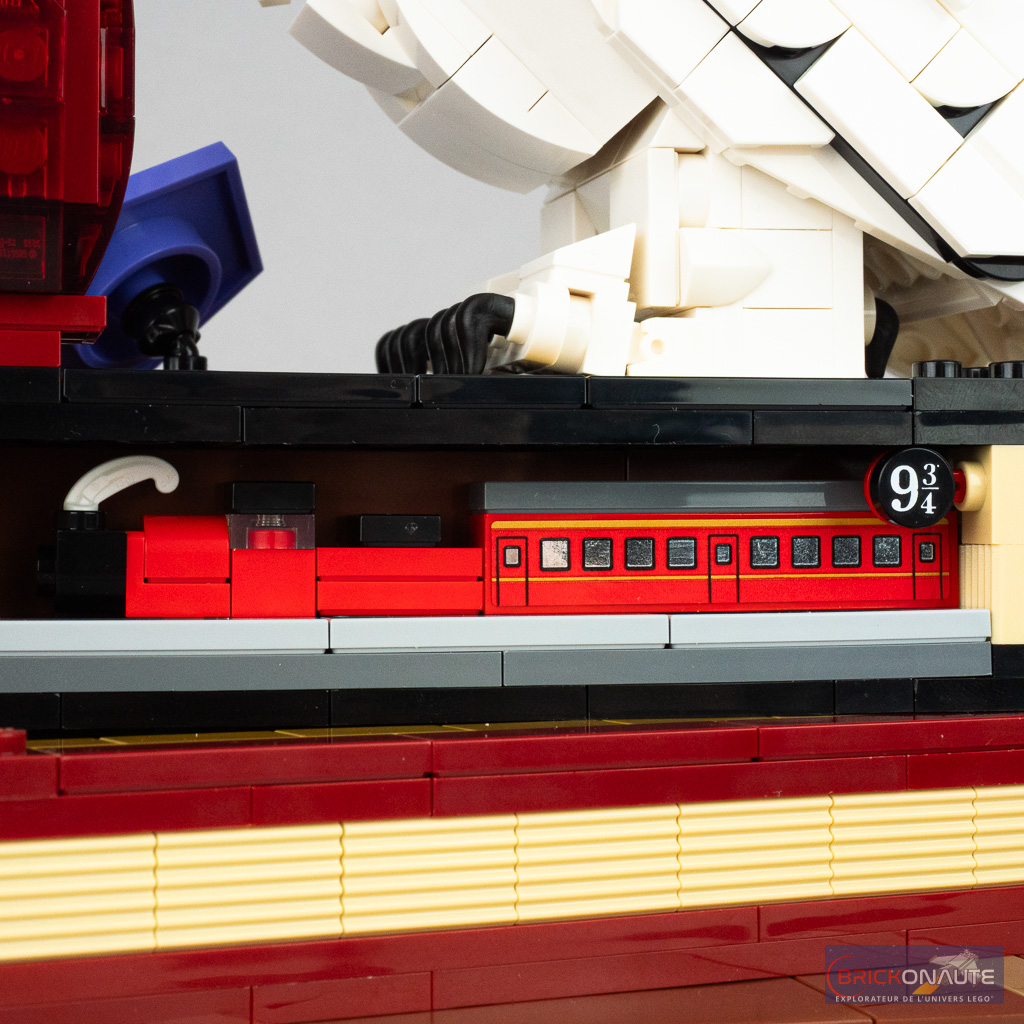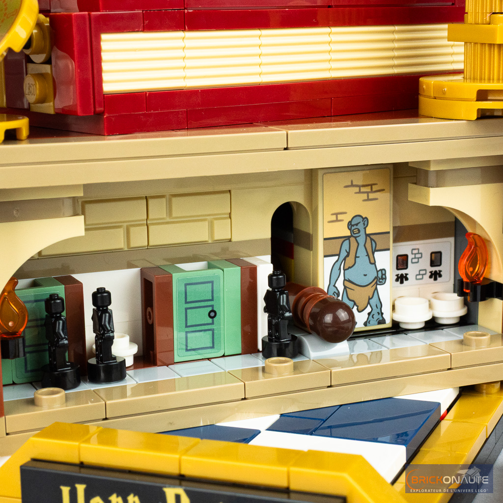 Même s’il s’agit d’un set destiné à un public adulte, LEGO a fait le choix d’intégrer quelques fonctionnalités et on ne va pas s’en plaindre. Le fonctionnement est centralisé sur 3 molettes situées à l’arrière de la construction et permettent de déplacer la reine, de faire tomber un mur (une paroi de la malle) grâce au gourdin du troll pour dévoiler une scène miniature complémentaire, et de faire tourner la tête d’Hedwige (la rotation est « infinie », il n’y a pas de butée).