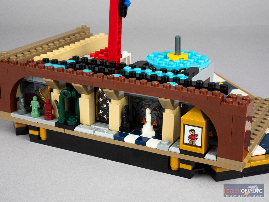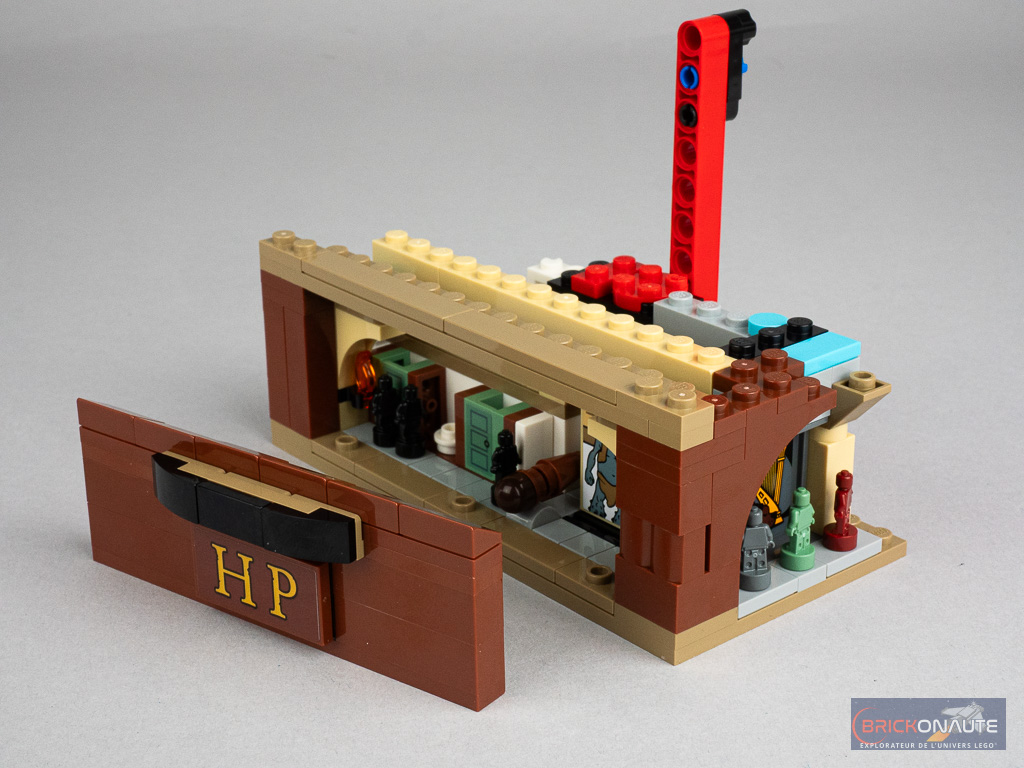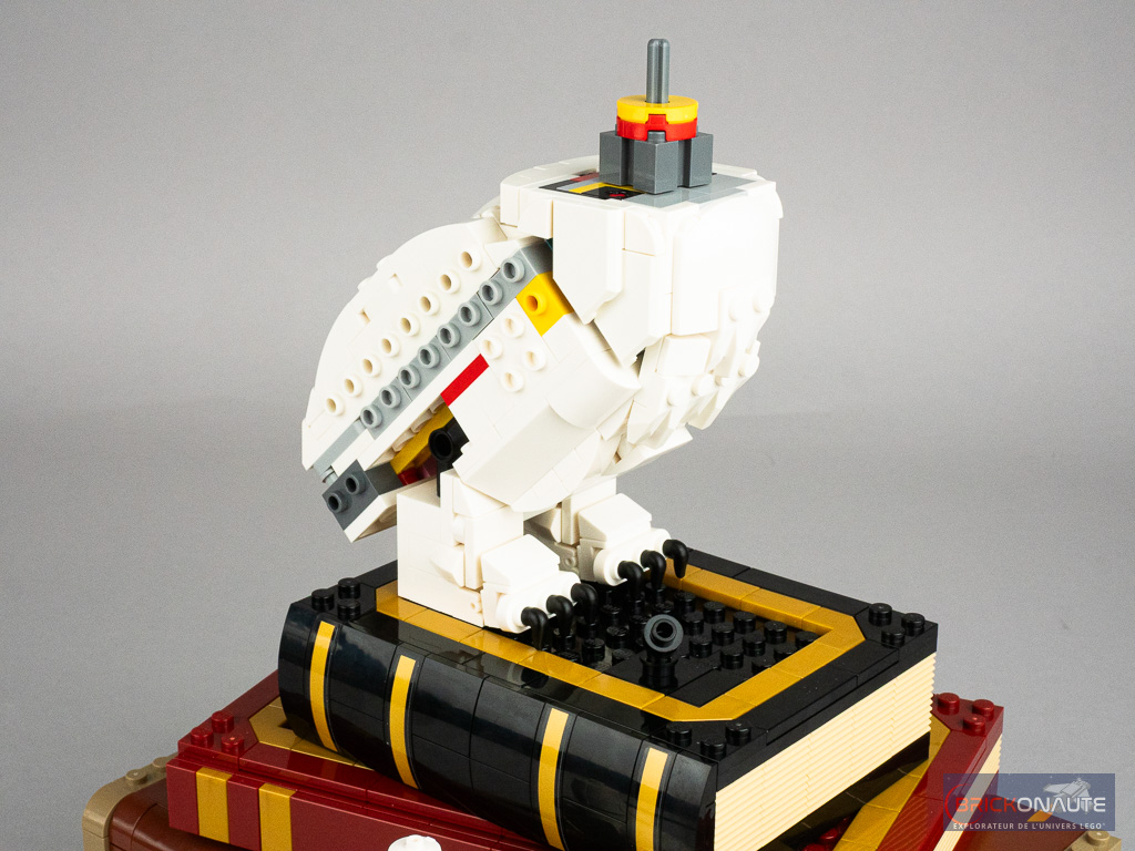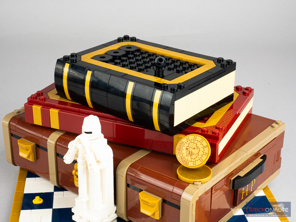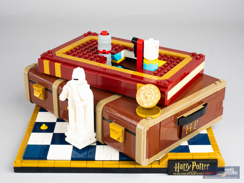 On assemble ensuite cette malle et elle recèle quelques surprises : un petit mécanisme pour faire « sauter » l’une des faces et révéler la scène d’attaque du Troll des Montagnes, un autre avec une crémaillère pour déplacer la reine sur l’échiquier, et une troisième pour faire tourner la tête d’Hedwige – le tout étant commandé par trois molettes sur l’arrière de la construction. On construit également dans cette étape quelques références microscale à des scènes importantes du film / livre.