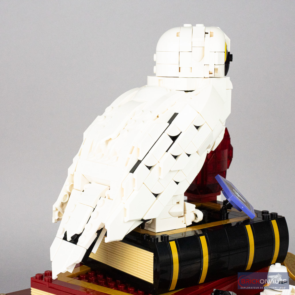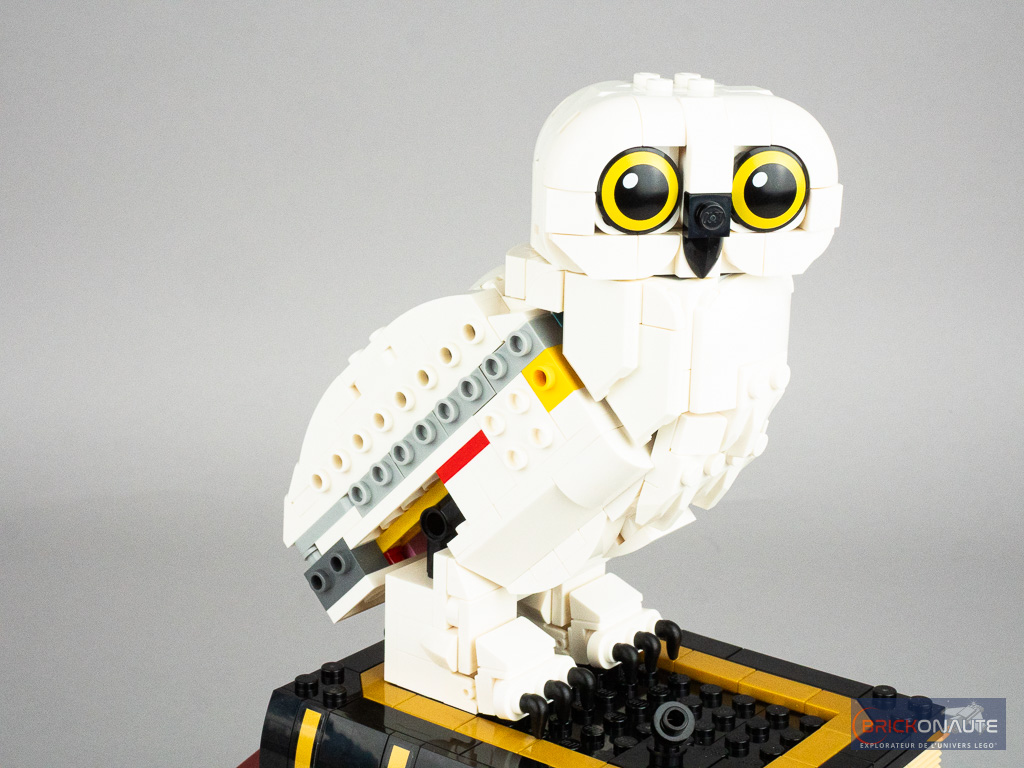 Plutôt qu’une sélection hétéroclite d’objets issus de la saga Harry Potter, cette boîte se concentre spécifiquement sur le premier volet Harry Potter à l’École des Sorciers. La pièce maîtresse reste évidemment la chouette Hedwige, ici proposée avec les ailes fermées. J’avoue ne pas être pleinement convaincu par cette interprétation : si le plumage est plutôt bien fait, je suis plus réservé pour les pattes un peu grossières, et pour la tête qui me semble un peu petite – dans l’ensemble même, je la trouve un peu maigrichonne.