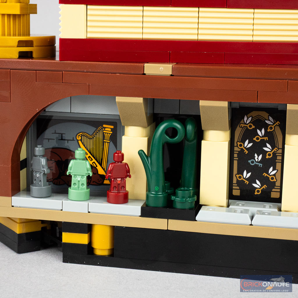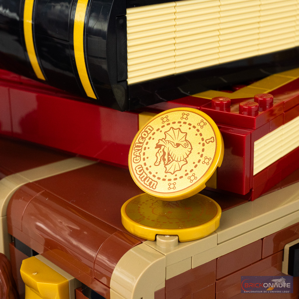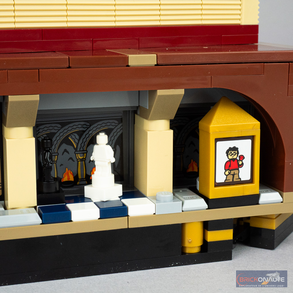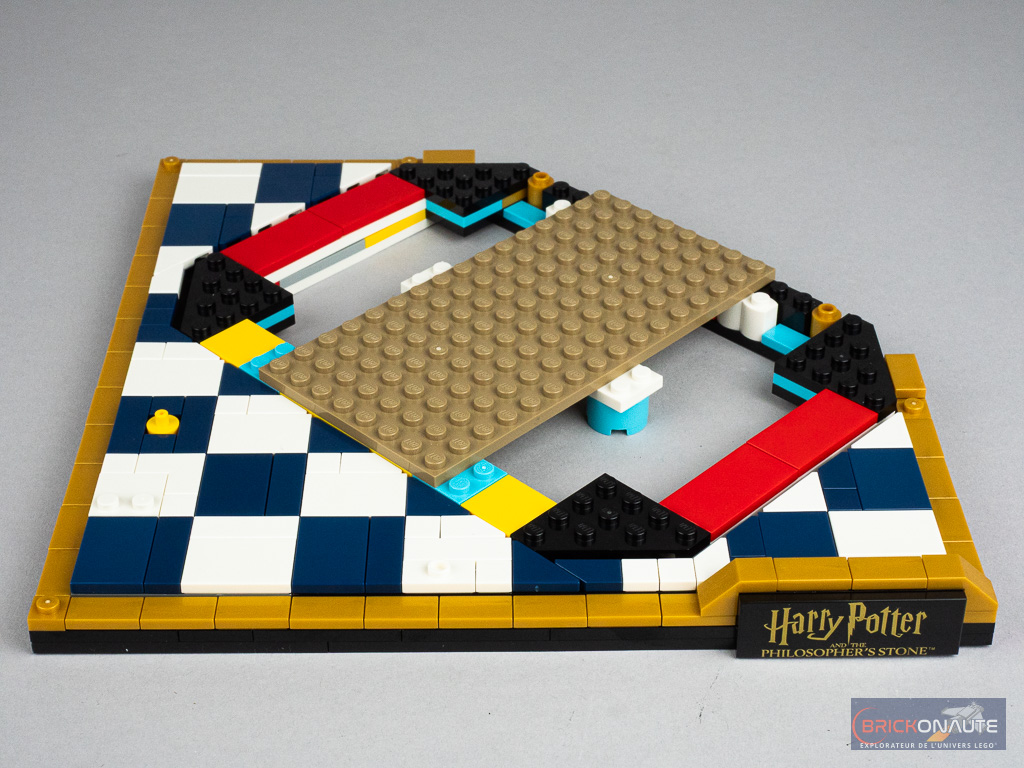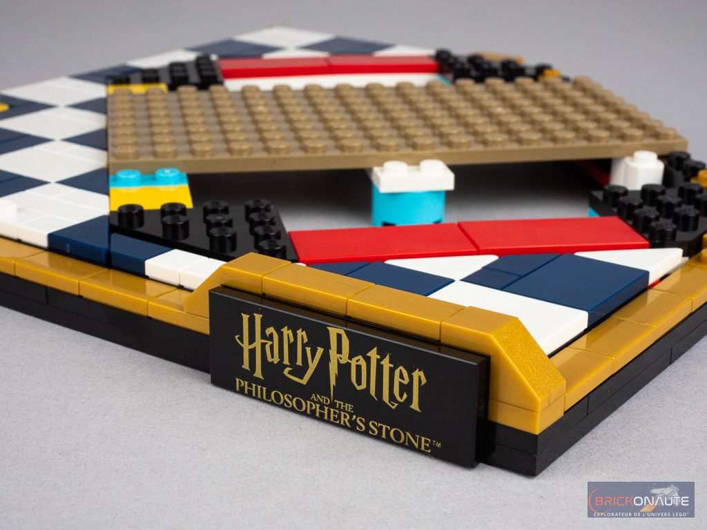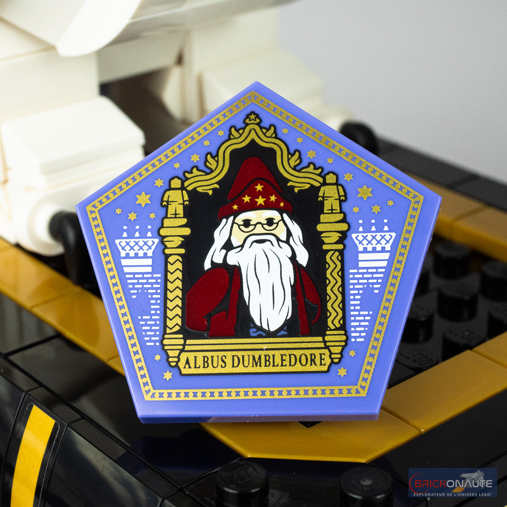 Les différentes constructions annexes (la pierre philosophale, le chandelier et les pièces d’échecs) sont particulièrement réussies et j’aime beaucoup l’idée de présenter l’ensemble sur un échiquier (incomplet sur l’arrière) – la bordure dorée et la petite plaque de présentation apportant un côté premium à la construction. Et j’ai un vrai coup de coeur pour la carte de Chocogrenouille, une pièce qui semble avoir été créée spécialement pour l’occasion avec une jolie tampographie d’Albus Dumbledore.