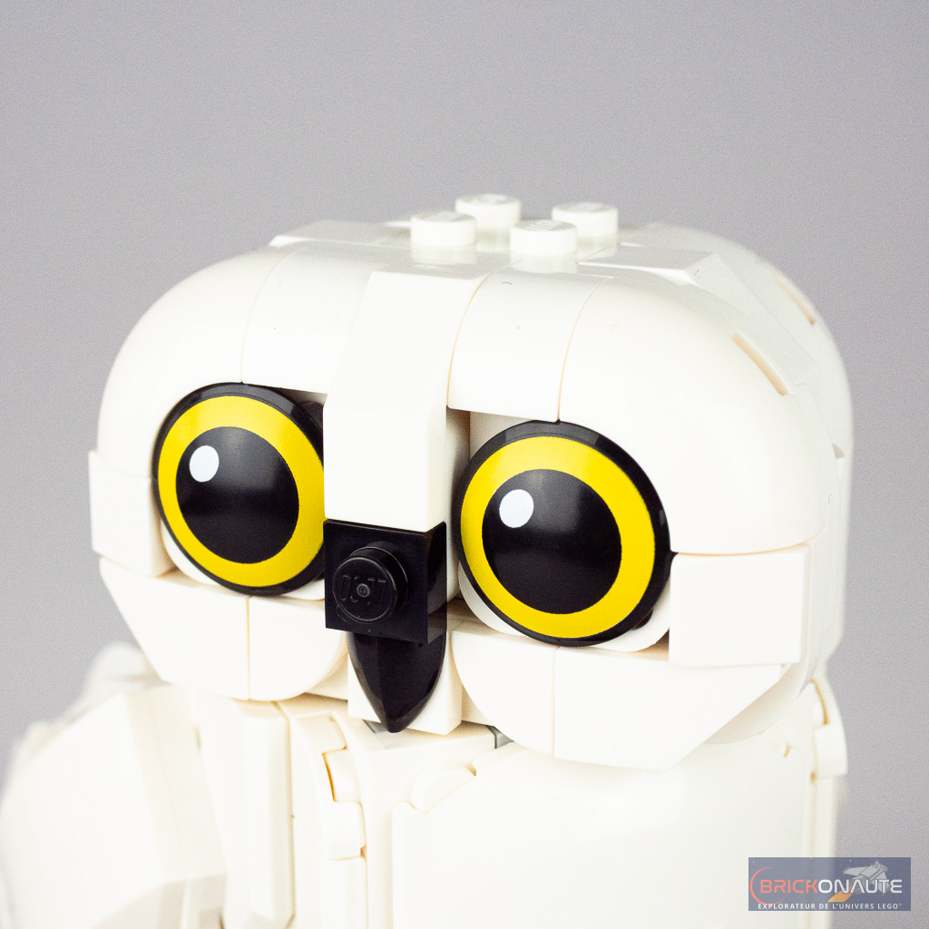 On continue naturellement avec Hedwige et là encore, la conception est intéressante dans l’obtention des angles entres les pattes, le corps et la tête du volatile. Un système de cardans traverse le corps pour transmettre le mouvement de la molette vers la tête et la faire tourner. Les deux ailes sont attachées en SNOT sur le corps et ne sont pas mobiles.