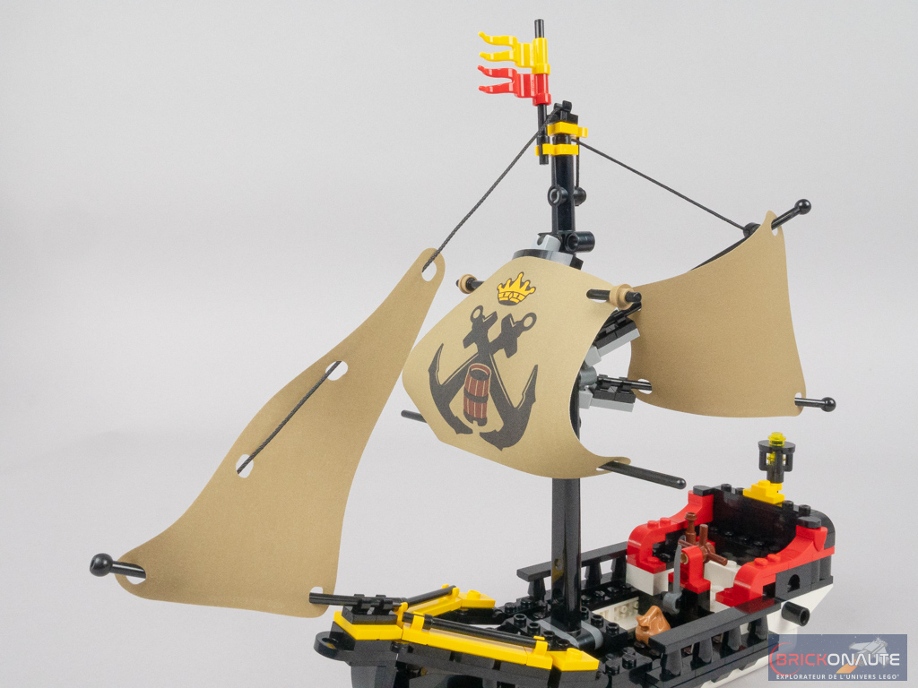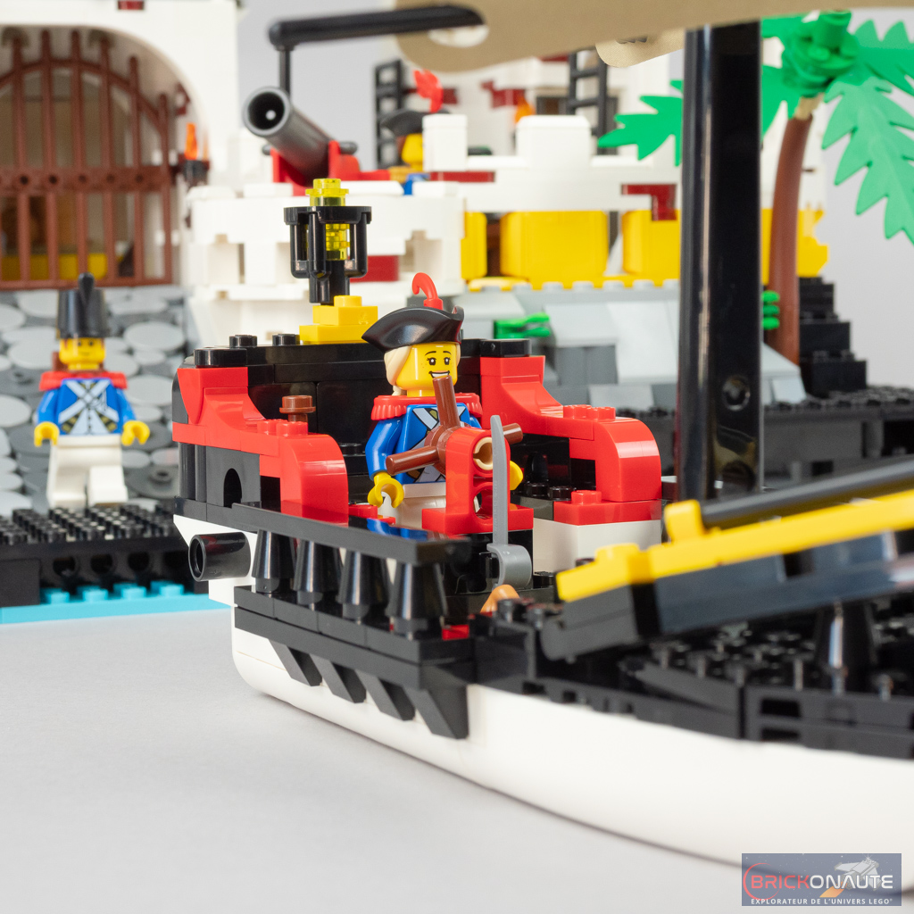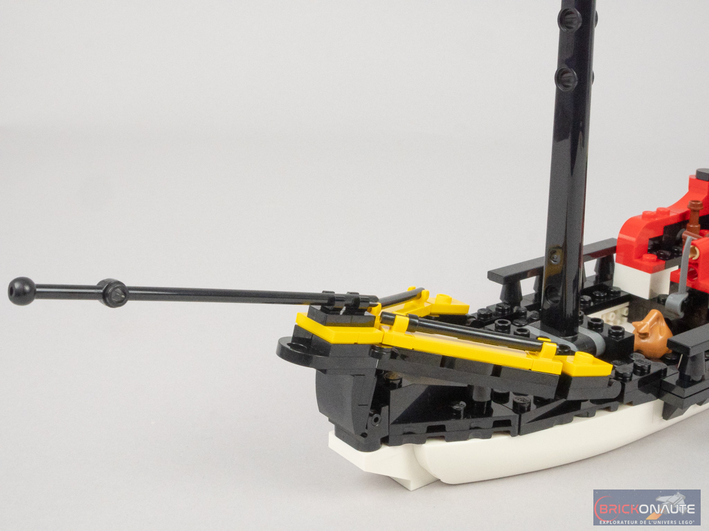 Le set original intégrait 2 barques, il n’y en a plus qu’une – l’autre étant remplacée par un joli bateau inspiré de celui présent dans le set 6277 Imperial Trading Post sorti en 1992. Un petit regret au sujet de ce bateau malgré tout : le pied du mât aurait mérité d’être mieux masqué, en l’état les éléments Technic utilisés restent trop visibles à mon goût.