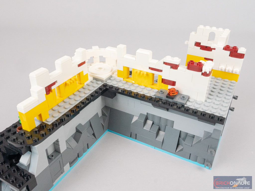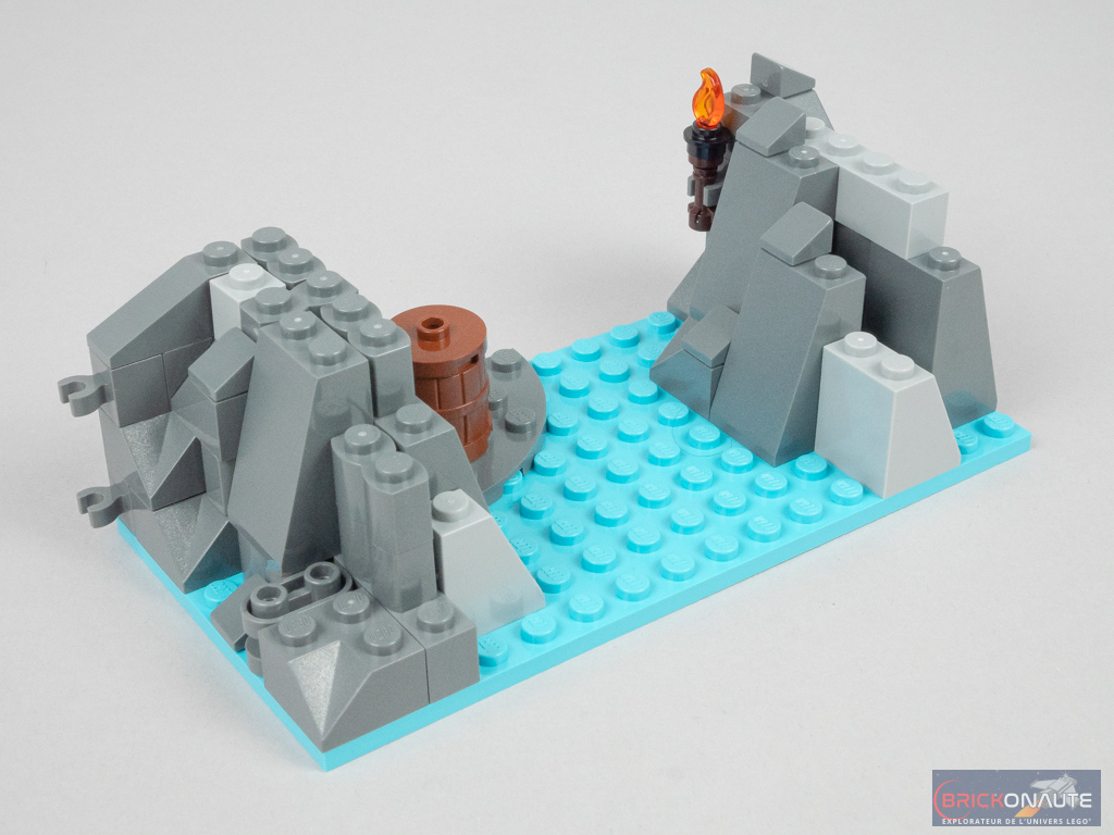 Au moins, on ne pourra pas reprocher à LEGO que cet hommage n’est pas fidèle à l’original : les proportions, les formes, les couleurs… tout rappelle son illustre ancêtre pour peu qu’on choisisse de le présenter en mode « forteresse ». Dans une version modernisée évidemment, le premier changement étant l’abandon de la plaque de base en 3 dimensions pour la remplacer par des assemblages de pièces grises pour les rochers. C’est un mal pour un bien – pour être honnête la base n’est pas passionnante à construire et fait gonfler le nombre de pièces (et le budget !) mais cette version brick built permet d’apporter une « texture » absente du modèle original.