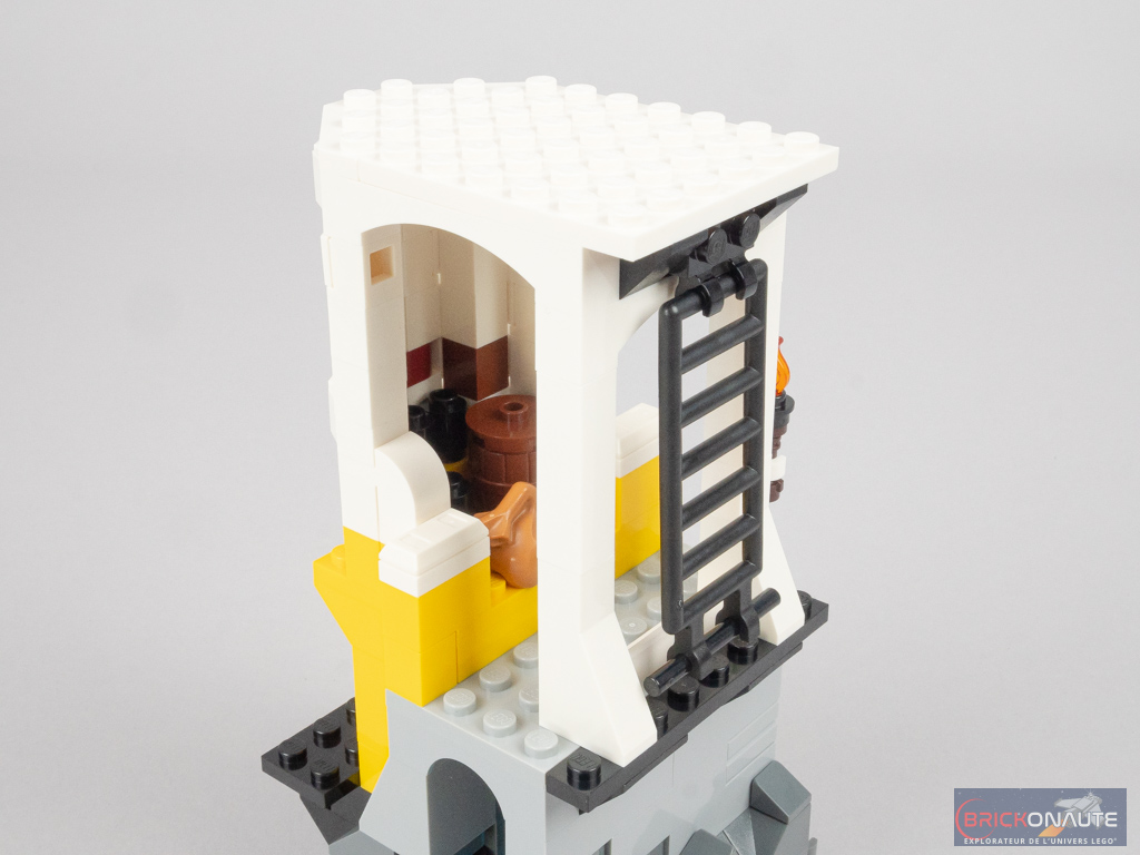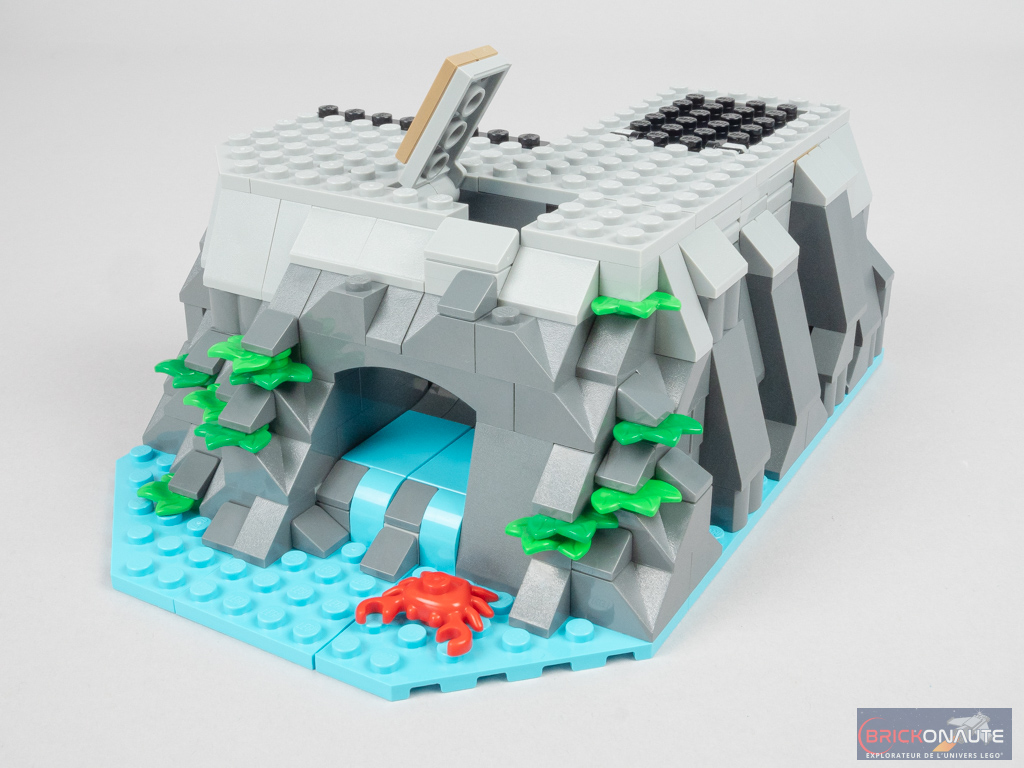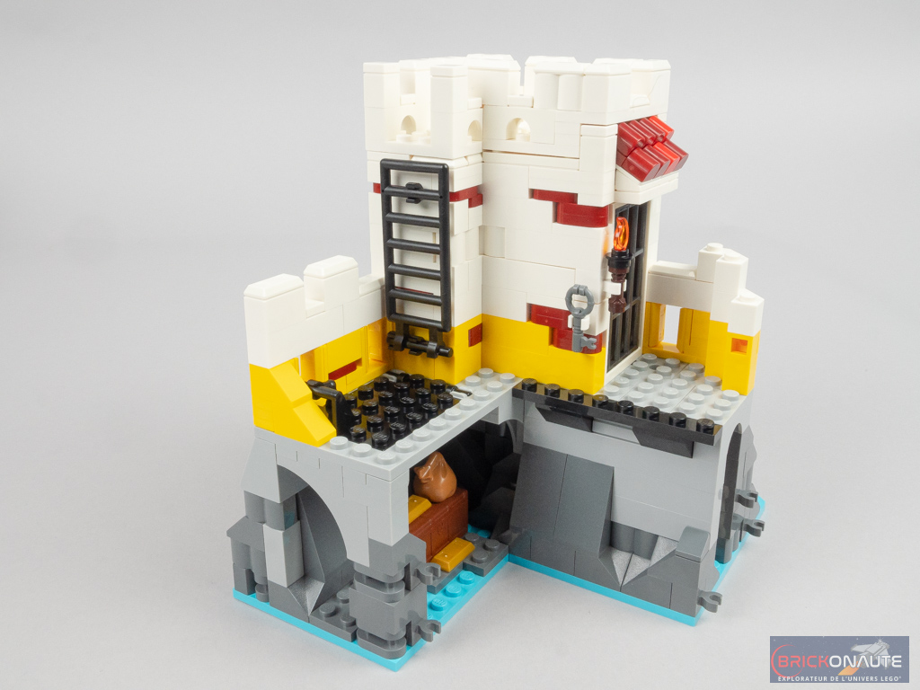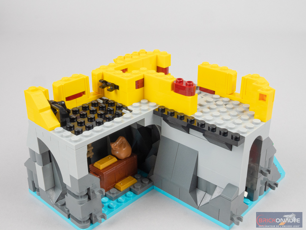 Si le set 6276 Eldorado Fortress sorti en 1989 faisait usage d’une plaque de base « 3D », cette solution n’est plus utilisée depuis bien longtemps chez LEGO. Et pour reproduire cette base, il faut donc se livrer à un empilement de briques assez peu intéressant mais qui a l’avantage d’être plus « flexible » et de permettre d’apporter plus de texture pour les rochers – ce sont ici des éléments de toiture, de couleur grise pour l’occasion. On retrouve, sur l’extérieur, le ponton noir et la petite tour blanche dans l’angle (sa base était jaune à l’origine). Une petite cache située sur l’intérieur renferme une lettre dont on ne connaît pas le destinataire.