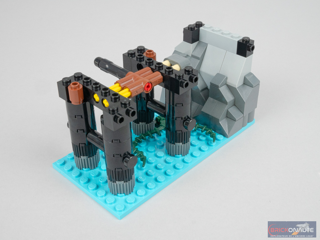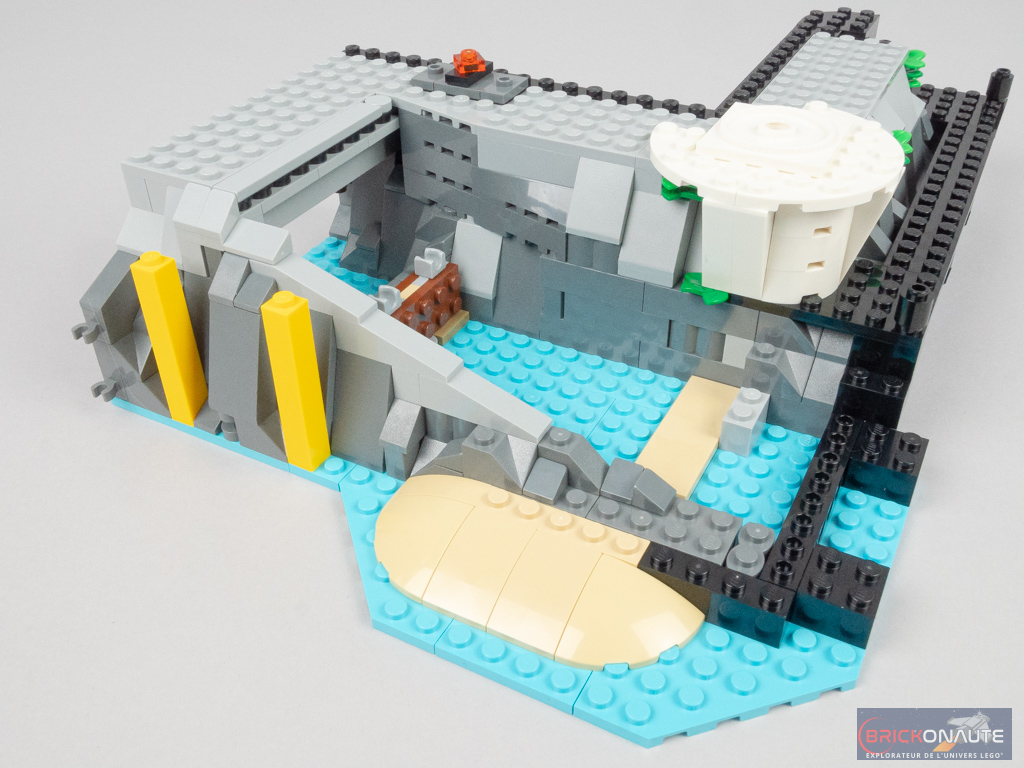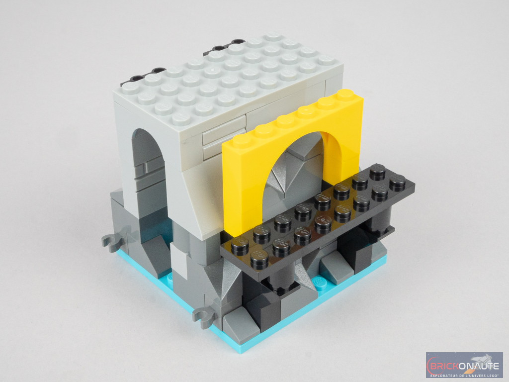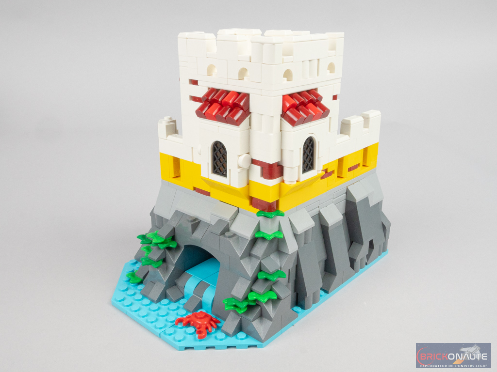 Si le set 6276 Eldorado Fortress sorti en 1989 faisait usage d’une plaque de base « 3D », cette solution n’est plus utilisée depuis bien longtemps chez LEGO. Et pour reproduire cette base, il faut donc se livrer à un empilement de briques assez peu intéressant mais qui a l’avantage d’être plus « flexible » et de permettre d’apporter plus de texture pour les rochers – ce sont ici des éléments de toiture, de couleur grise pour l’occasion. On retrouve, sur l’extérieur, le ponton noir et la petite tour blanche dans l’angle (sa base était jaune à l’origine). Une petite cache située sur l’intérieur renferme une lettre dont on ne connaît pas le destinataire.