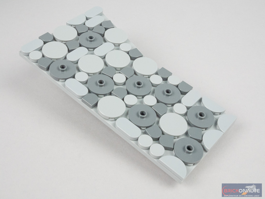 L’étape suivante voit l’assemblage d’une « extension » de la base, avec ses rochers, qu’on vient ensuite attacher à l’ensemble construit précédemment. On solidarise les deux ensembles (notamment avec les deux ball joints visibles au centre) puis on continue d’élever les parois et on ajoute le sol au niveau supérieur. Les deux pylônes jaunes viennent rappeler ceux qui se situaient là dans le set 6276. On passe ensuite à la construction de la rampe d’accès, décorée de tiles dans deux nuances de gris et disposant d’un petit « débord » en partie supérieure. Elle vient parfaitement s’insérer dans l’emplacement prévu à cet effet et se fixer sur les deux ball joints en dessous – c’est très satisfaisant. Sous l’accès principal, un tonneau contient quelques doublons cachés.