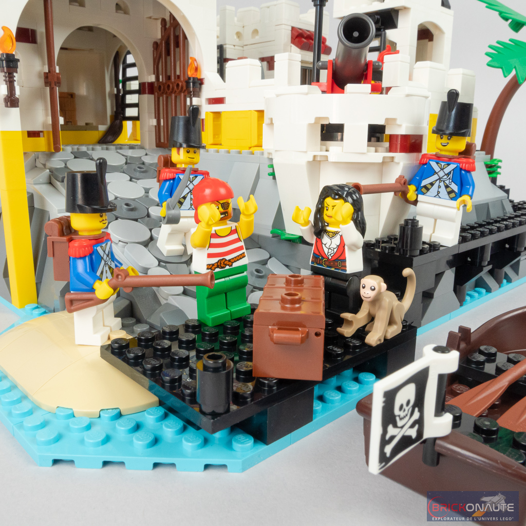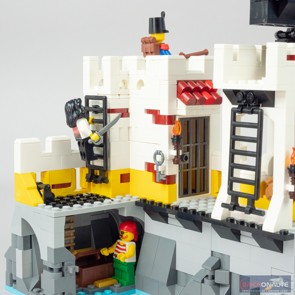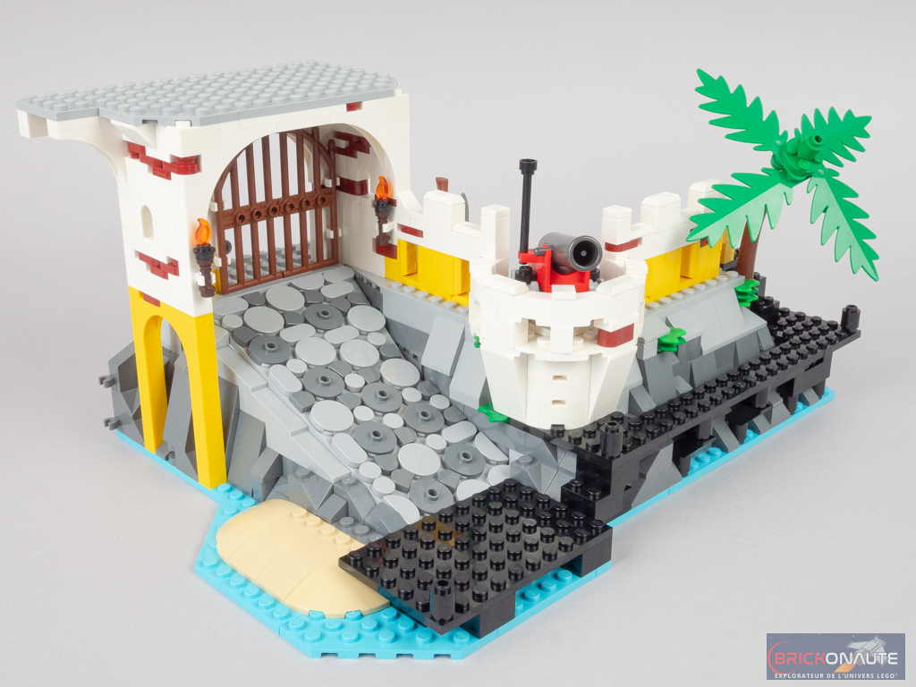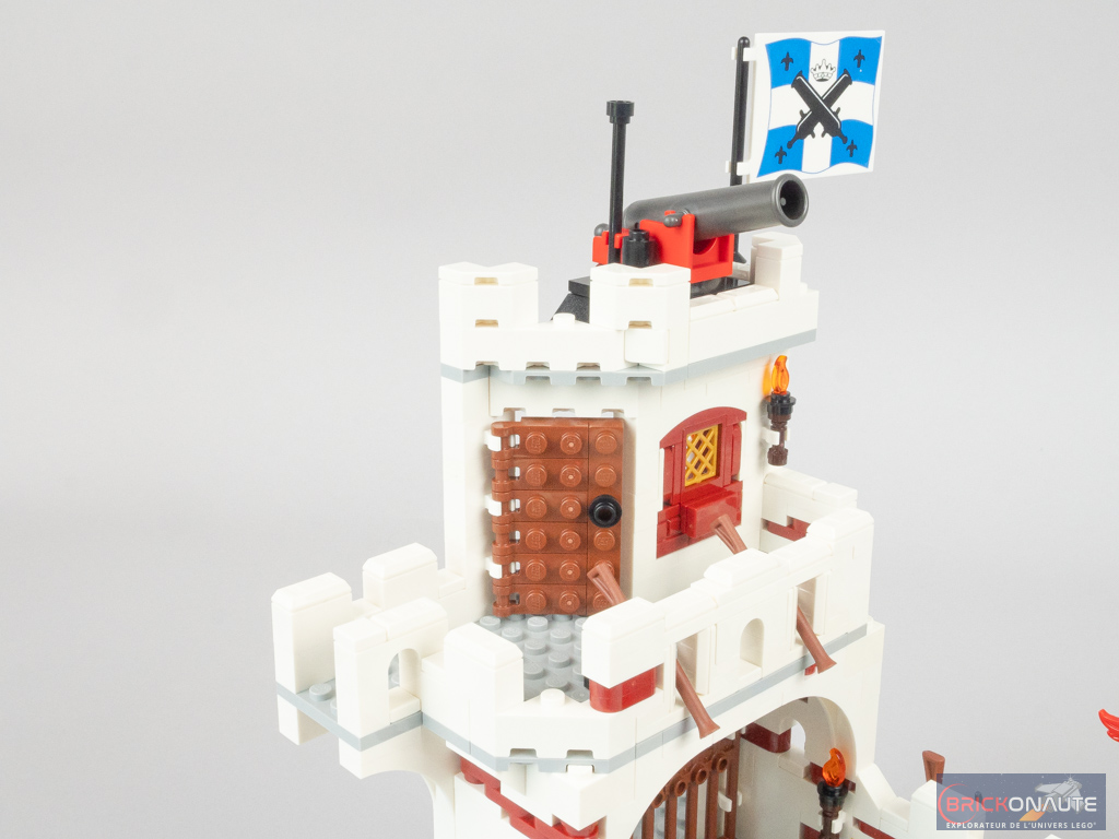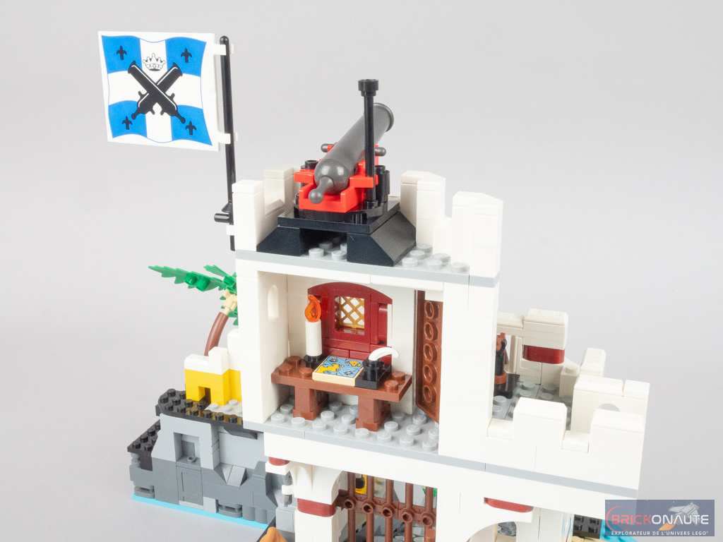 Tout est plus « moderne », tout en conservant l’esprit du set original. Les créneaux sont plus jolis, les panneaux tampographiés sont remplacés par des assemblages, la grue est très bien conçue… et on conserve l’agencement initial, les canons ou les palmiers si reconnaissables dans la gamme LEGO Pirates – avec un tronc différent malgré tout. J’aime beaucoup cette idée d’intégrer des éléments dark red dans les murs, qui apportent de la texture et font penser à un mur de briques qui se révèle sous l’enduit usé par le temps.