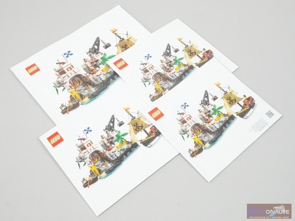 À l’intérieur, on trouve 20 sachets de pièces numérotés de 1 à 10, et un sachet non numéroté. Une pochette en papier contient les voiles du bateau, et une autre en carton les 4 notices. Étrangement, les notices ne sont pas numérotées – à nous de les ouvrir pour savoir par laquelle commencer. Même si en fait cela a peu d’importance : il s’agit de constructions indépendantes les unes des autres, on pourra donc partager la construction. La première notice commence par quelques pages de présentation du set, de son designer et de sa source d’inspiration – la référence 6276 Eldorado Fortress de 1989.