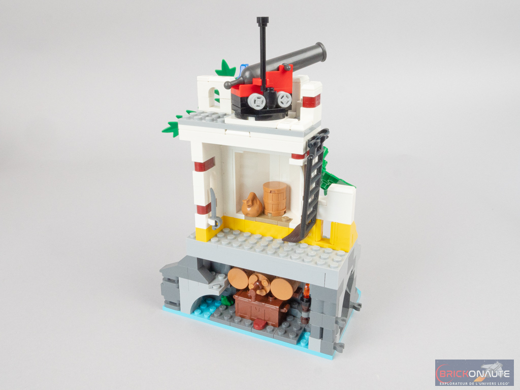 S’agissant d’un set destiné avant tout aux adultes nostalgiques, il se devait aussi de proposer une bonne dose de jouabilité et là encore, c’est chose faite. Au delà des nombreuses mises en scène possibles, le set propose quelques fonctionnalités : une trappe dans le quai qui s’ouvre avec un petit levier à pousser, une autre trappe permettant aux pirates de s’échapper de la prison, une troisième reliant une caverne au fort, une grue avec un treuil fonctionnel et, évidemment, 3 canons pour que les soldats puissent se défendre de l’invasion pirate. Deux canons sont prévus pour être facilement détachés de leur support.