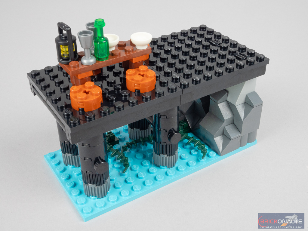 Avec le sachet de pièces portant le numéro 7, nous construisons un ponton qui vient s’attacher à la construction précédente. Sa conception est assez simple : des rochers d’un côté, des pieux de l’autre, et un petit système permettant de faire tomber une trappe en poussant un levier – le genre de fonctionnalité toute simple que j’aime retrouver dans ces sets destinés aux adultes. On ajoute également une table avec quelques victuailles.