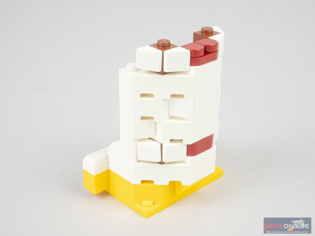 On élève alors les murs du dernier module, jaunes dans leur partie basse puis blanche à mesure qu’on monte. On retrouve toujours les petits éléments dark red qui viennent amener un peu de texture – c’est une vraie bonne idée. Les petits morceaux de toit, avec des tuiles, sont fixés sur des charnière. Et l’une des deux fenêtres se détache facilement pour accéder à l’intérieur de la prison. Il ne reste qu’à construire un morceau de toit avec quelques créneaux, qu’on pose sur le dessus à la manière d’un bâtiment modulaire, et l’assemblage est terminé.