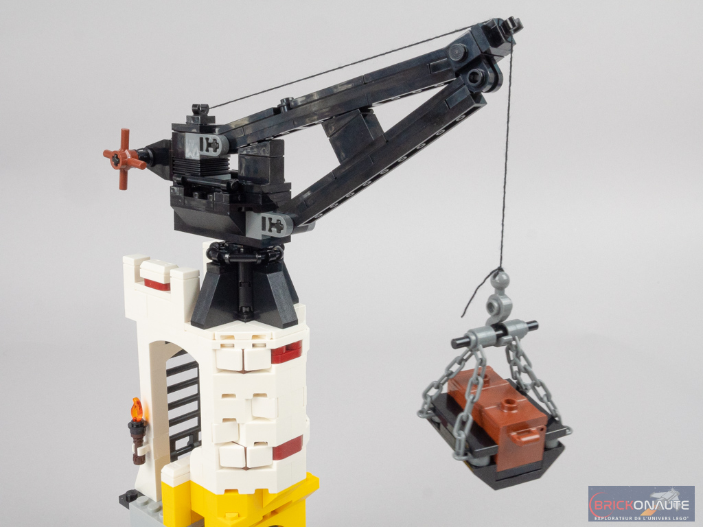 Le module suivant est basé sur une petite plate de 8×8 tenons. Vous connaissez la musique : on commence par un empilement de pièces grises, en guise de rochers. On ajoute les fondations (gris clair), quelques éléments jaunes dont une arche à la base des murs, puis on construit la tour (un petit sous-assemblage réalisé à part). On aménage sommairement l’intérieur puis on ajoute le toit avec des créneaux. On passe alors au dernier sous-assemblage, la grue. Et elle est plutôt bien conçue avec deux flèches formant un triangle. On ajoute un câble et un crochet, ainsi qu’une plateforme avec un trésor à soulever.
