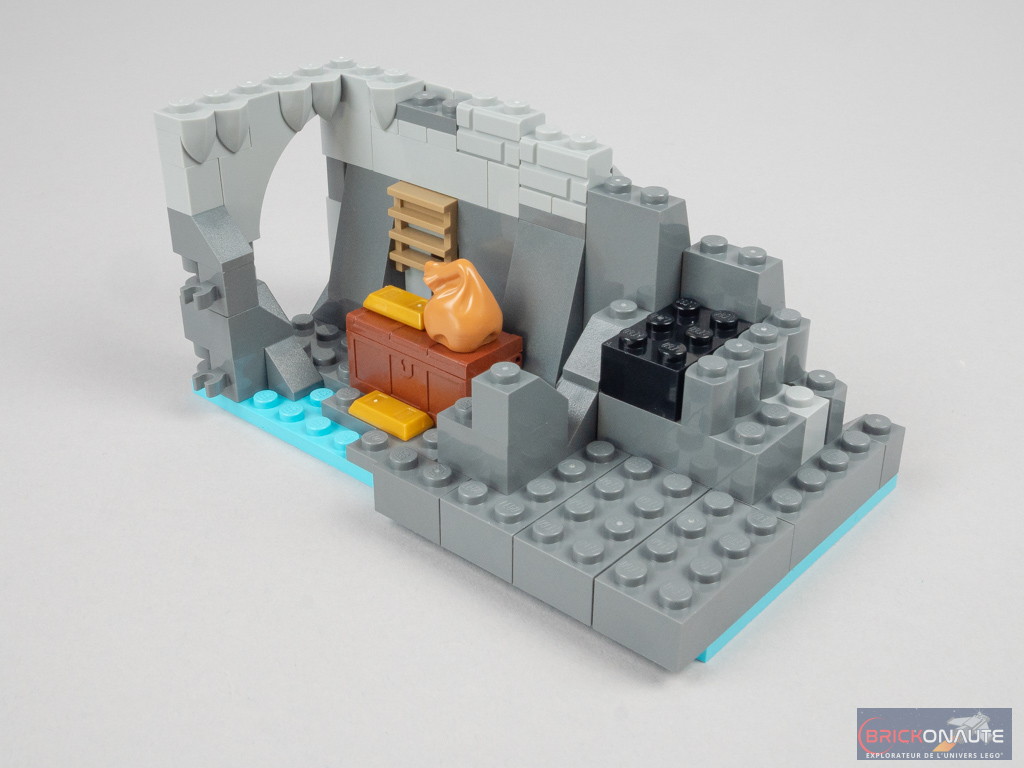 Une fois ouvert, on accède depuis l’arrière du modèle à l’ensemble des intérieurs. Et il y a ce qu’il faut avec de nombreuses cavernes planquées dans les rochers permettant aux pirates de s’infiltrer dans le fort. Avec des accessoires dans toutes les salles, autant dire qu’il y a de quoi faire niveau mises en scène avec les 8 minifigs fournies – je me suis bien amusé à faire les photos de cet article !
