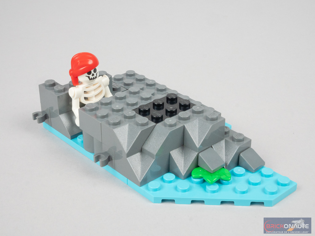 On attaque ensuite le dernier module, basé sur une plate de 8×16 tenons qu’on viendra agrandir par la suite. On y monte des rochers, et on y aménage une petite caverne au trésor avec un coffre – accessible par une trappe et une échelle. On prolonge le module avec un sous-ensemble qui cache, dans les rochers, le squelette d’un pauvre pirate. On aménage ensuite un système de « fuite » avec 4 grandes slopes, donnant sur une trappe par laquelle les pirates pourront sauter pour s’enfuir. On masque cet échappatoire avec de nombreux rochers et un peu de végétation.