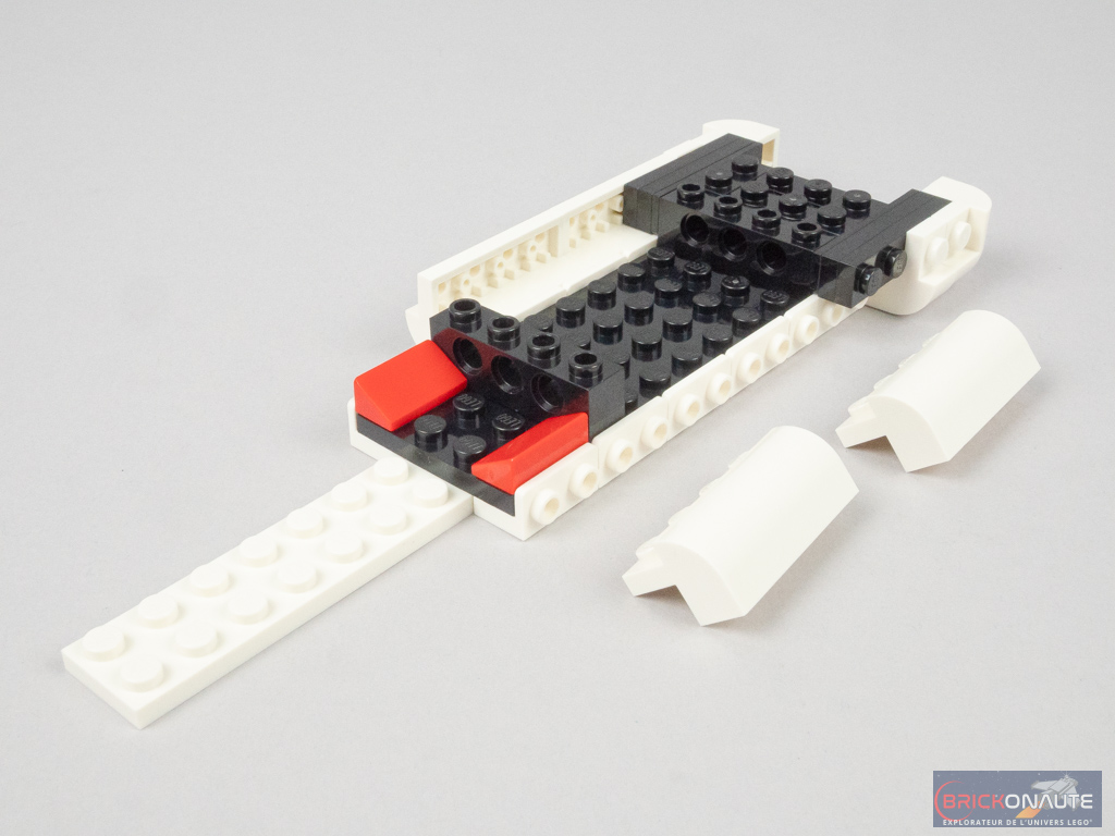 Les 3 sachets portant le numéro 1 sont dédiés à la construction du bateau, inspiré de celui présent dans le set 6277 Imperial Trading Post sorti en 1992. La partie inférieure de la coque, blanche, est principalement constituée d’éléments utilisés habituellement dans les carrosseries de voitures. La partie arrière est assez simple dans sa conception mais fait un usage intéressant d’éléments rouges pour souligner les formes du navire. Une lanterne est clipsée à l’arrière, et la barre fixée sur un pin Technic.