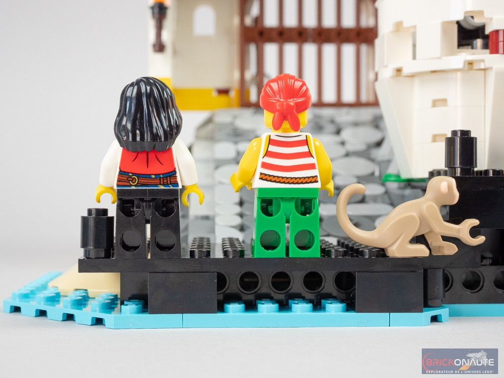Le deuxième pirate rappelle fortement celui présent dans le set de 1989 avec son marcel rouge et blanc, et son bandeau rouge sur la tête. Le visage est cependant bien différent avec une barbe rousse en friche et un cache-oeil. On notera enfin la présence d’un singe – mais pas celui avec les 4 mains que tout le monde aimerait revoir.