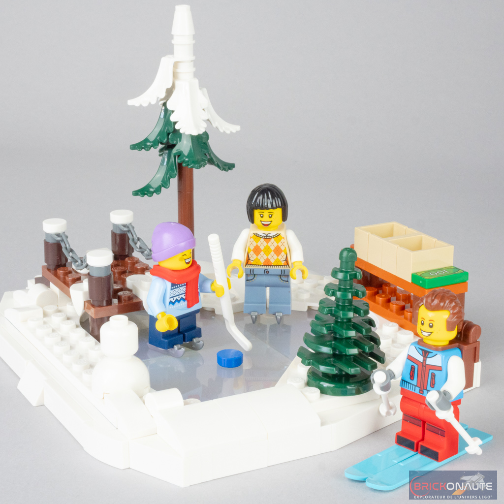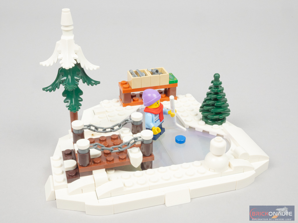 La dernière construction « annexe » est un petit lac gelé. On commence par assembler une structure intégrant de grands panels bleus scintillants, pour former la glace. Cette structure comporte des briques SNOT pour décorer l’ensemble avec des grandes plates blanches pour la neige, un petit ponton et ses chaînes, un bonhomme de neige, deux sapins et un stand de location de patins à glace avec des caisses en contenant.