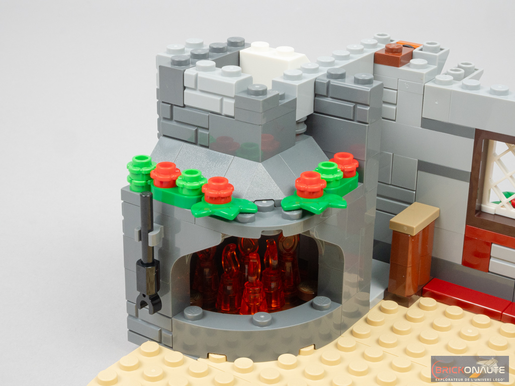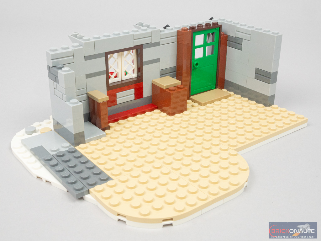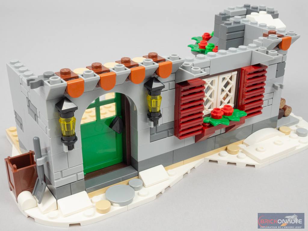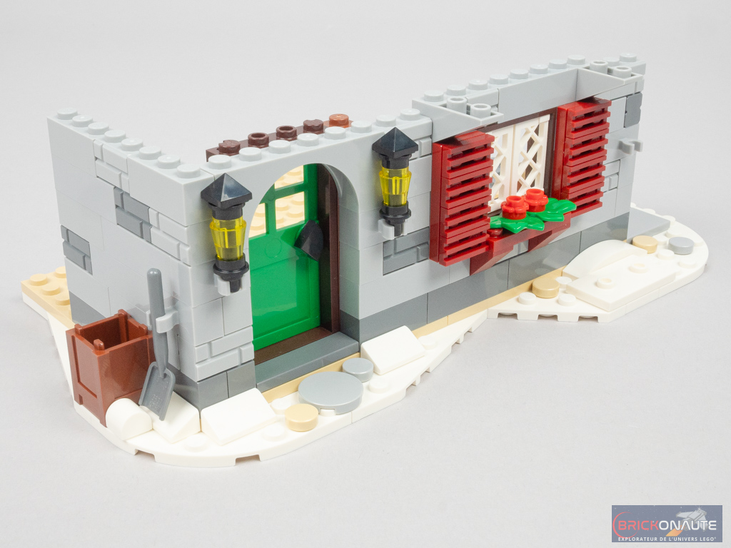 Sur une base blanche surmontée de pièces tan, on commence par élever les murs en pierre et ajouter la porte d’entrée et la fenêtre du rez-de-chaussée. Côté extérieur, elle est décorée de deux jolis volets à base de grilles dark red. Sur les côtés de la porte, on trouve deux petites lanternes.