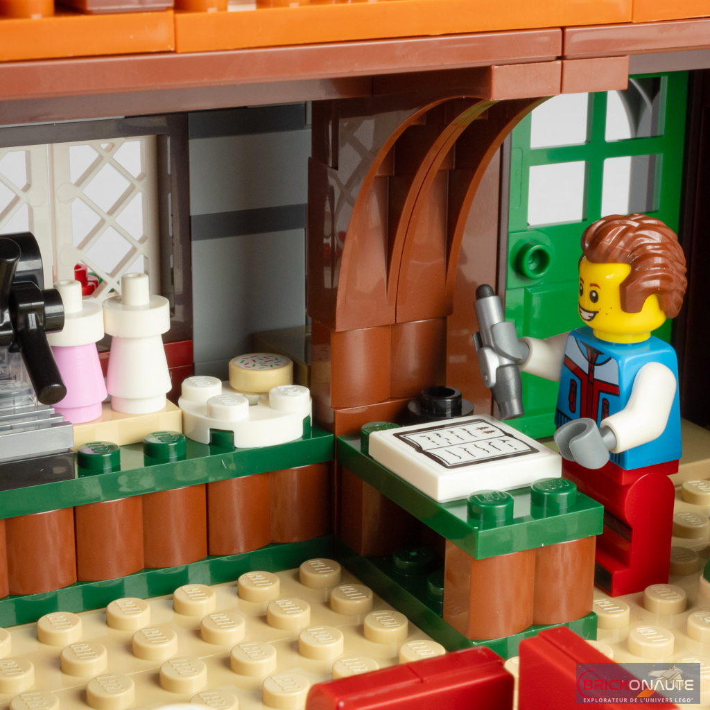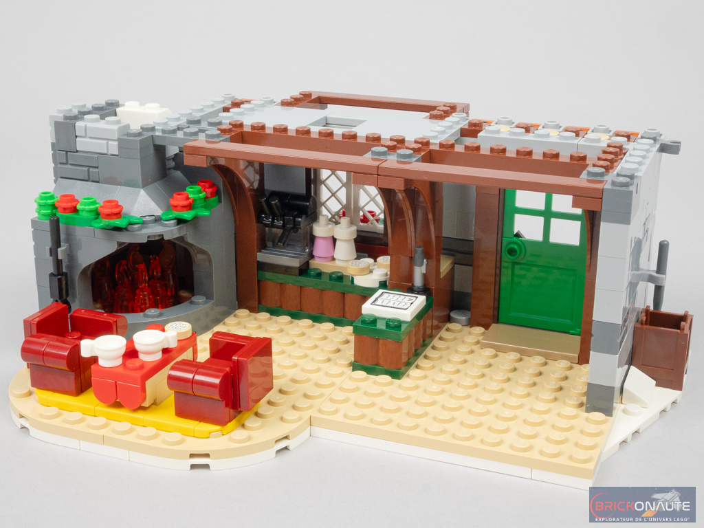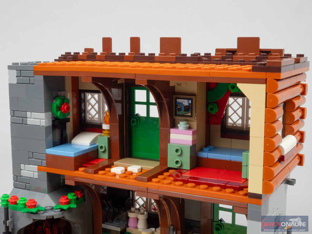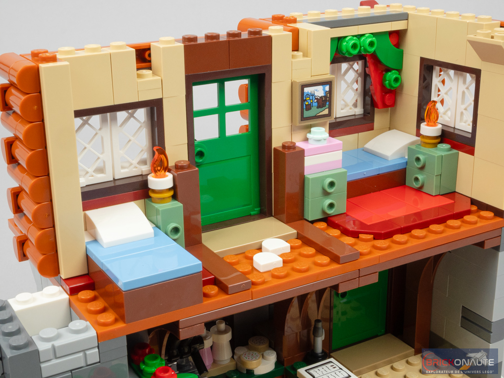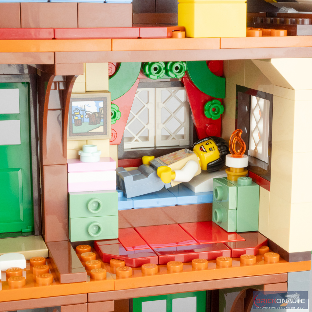 Côté intérieur, l’aménagement est plutôt riche avec un rez-de-chaussée abritant le séjour avec une très jolie cheminée, un coin salon, un morceau de cuisine avec une machine à café et quelques gourmandises, et le sapin de Noël. Les deux étages abritent les chambres et les meubles qui vont avec. J’apprécie ici qu’on dispose de suffisamment de profondeur pour pouvoir mettre les minifigs en situation.