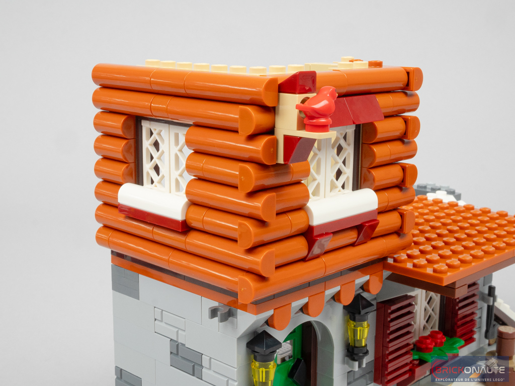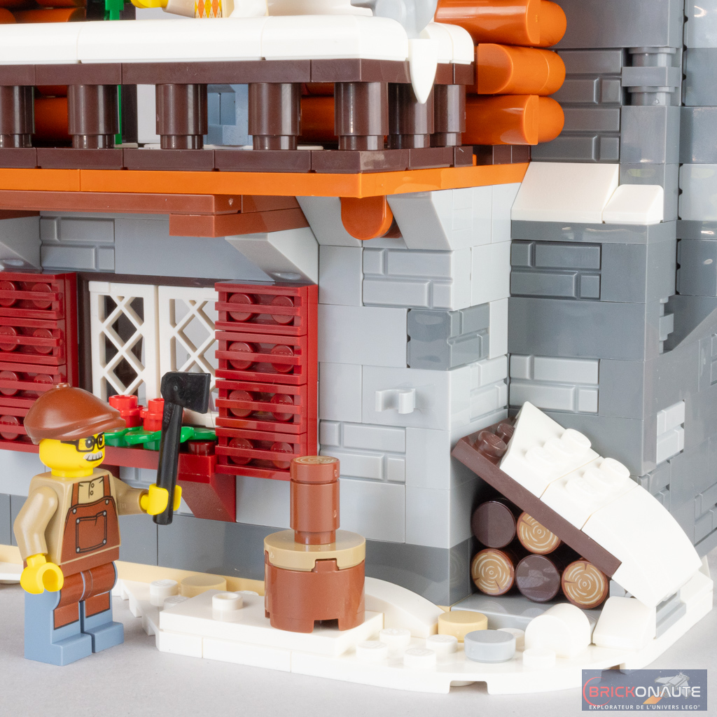 J’aime beaucoup le choix des couleurs et la composition du chalet, avec cette base en pierres grises, ce 1er étage en rondins de bois et le pignon d’une couleur plus foncée. Le tout est recouvert de neige et longé par la cheminée, et le premier étage propose un joli balcon et une chambre en léger encorbellement. On remarque aussi évidemment tous les petits éléments de détail avec les volets, le petit tas de bois et le billot, l’enseigne, les feuilles et fleurs colorées ou le petit nichoir avec un oiseau – sans oublier la manière dont se « croisent » les rondins dans les angles, c’est vraiment très bien fait.