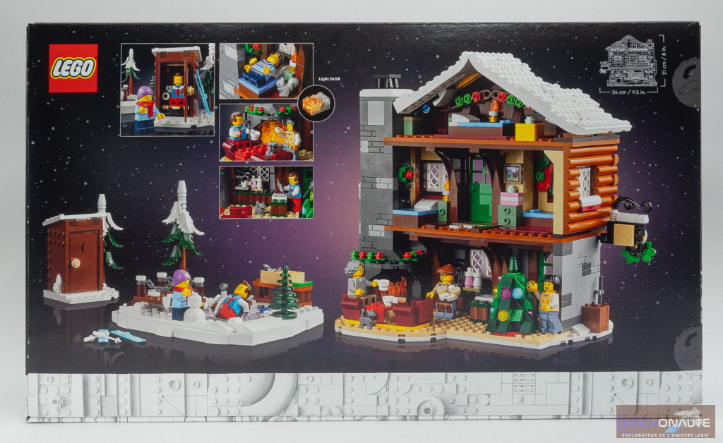 Sur la face avant de la boîte à la livrée noire habituelle des sets de la gamme LEGO Icons, notre set est mis en scène vu de face avec les différentes minifigs vaquant à leurs occupations. Au dos, on découvre l’intérieur du chalet et quelques images de détail. On apprend que le set contient une brique lumineuse, ici destinée à éclairer le feu de cheminée.