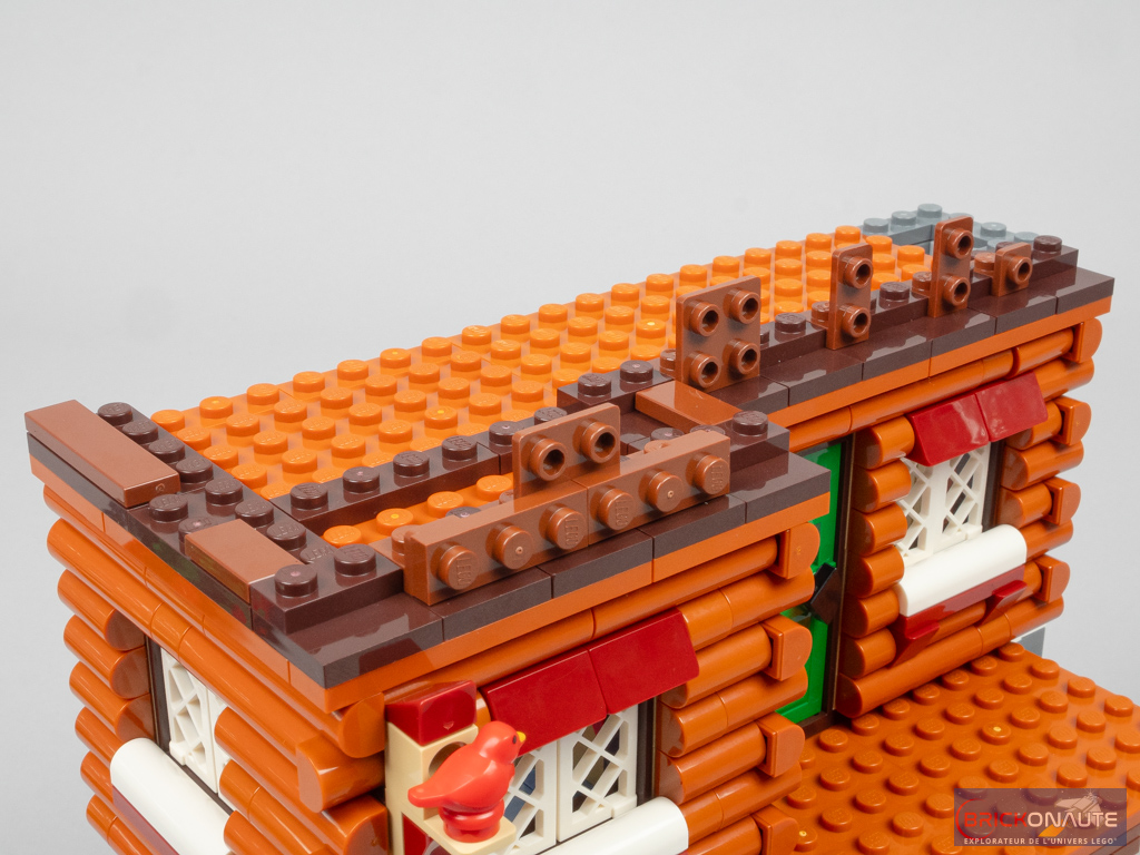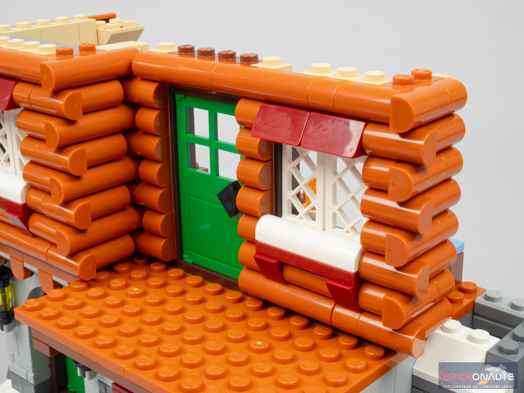 Une lecture rapide de l’inventaire ne m’a pas permis de déceler d’éléments spécifiques ou rares, si ce n’est les feuilles servant à la construction des sapins extérieurs en blanc et en dark green. On notera aussi une jolie variété d’éléments couleur dark orange pour la réalisation de la façade extérieure et de ses rondins de bois – et donc de nombreux éléments en forme de demi-cylindre qui devraient donner quelques idées aux MOCeurs aguerris. Reste que l’inventaire est plutôt généreux avec ses 1517 pièces.