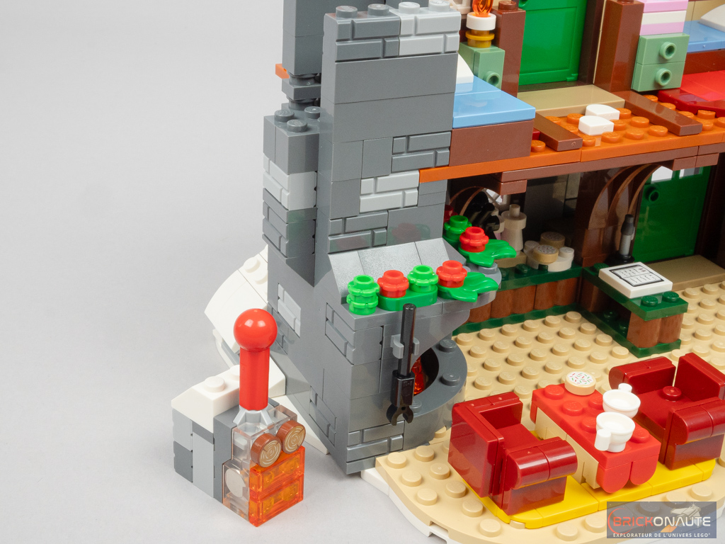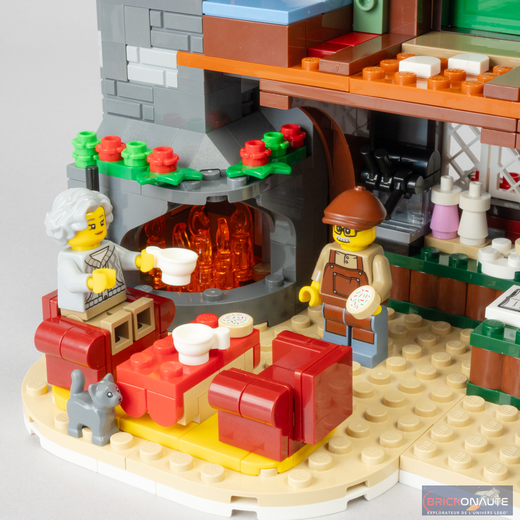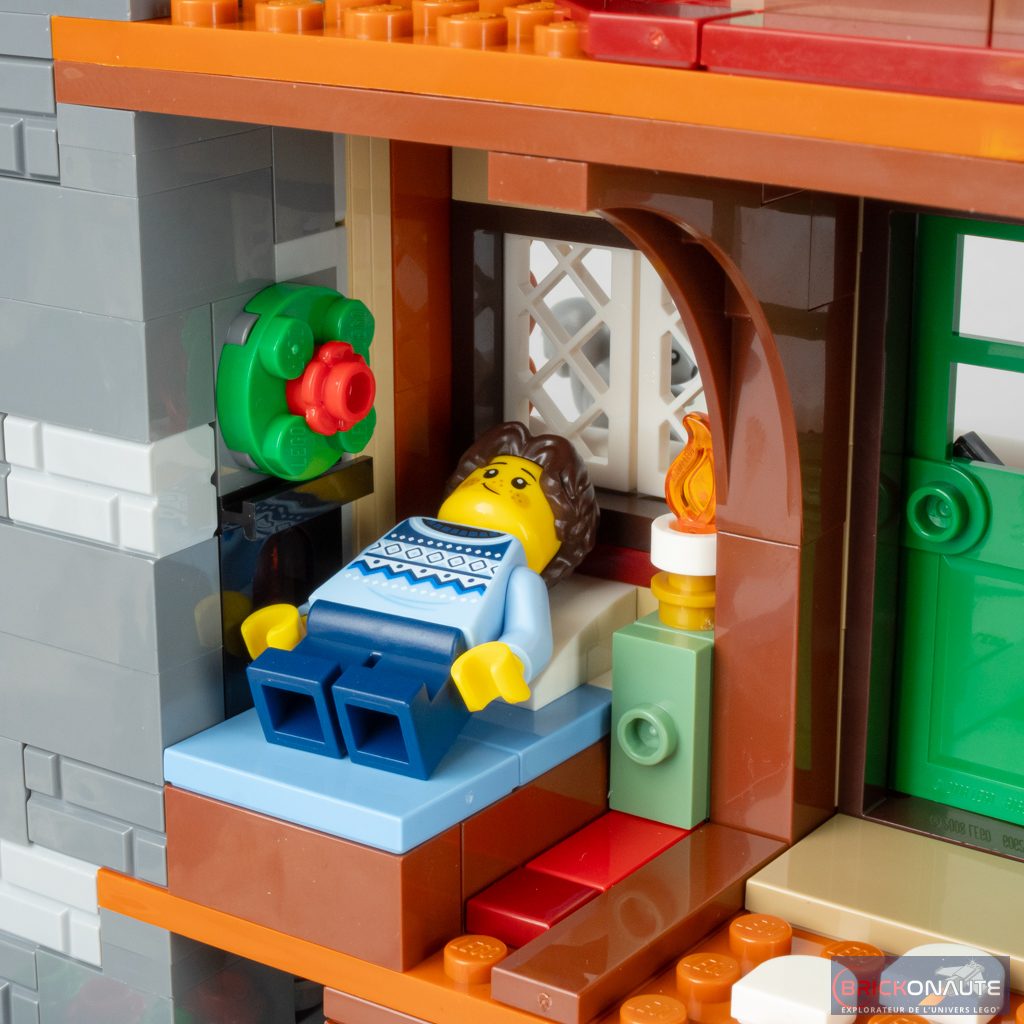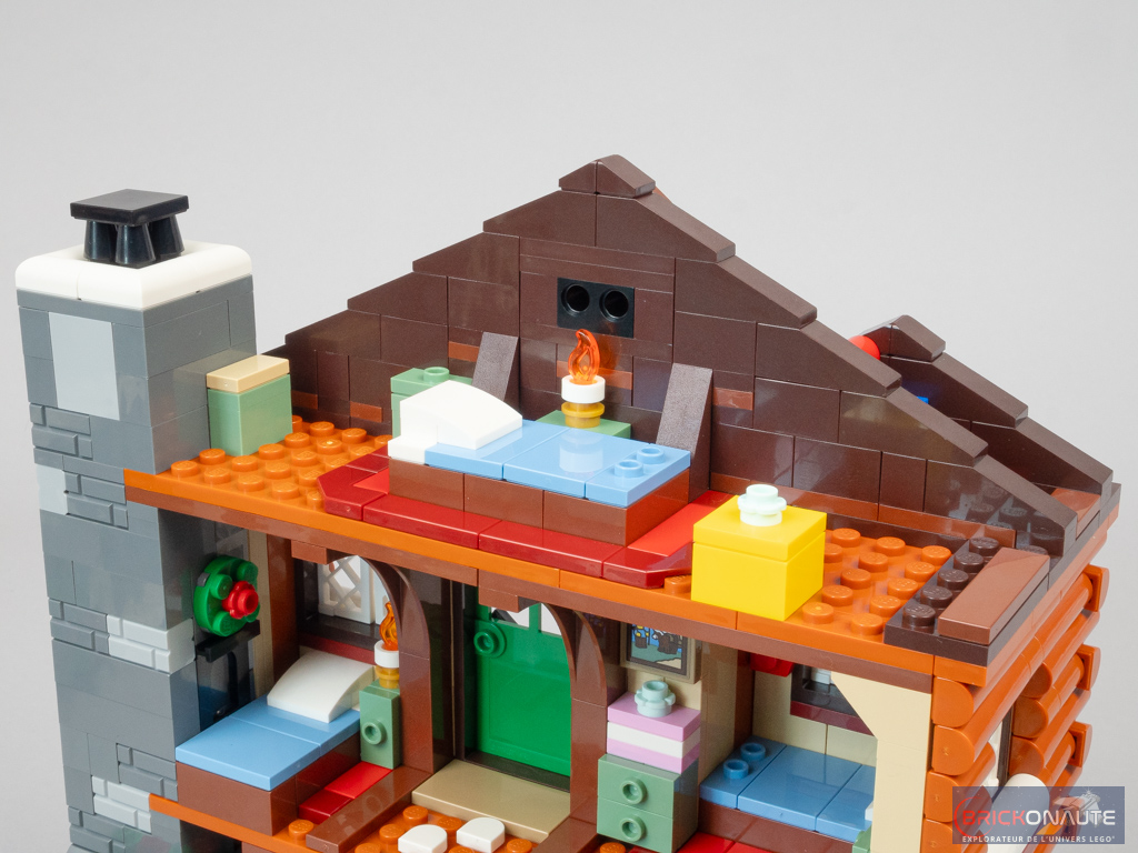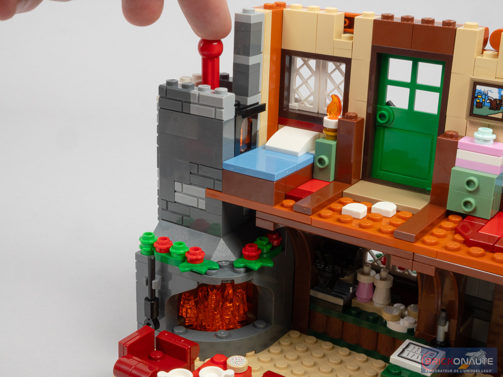 La cheminée intègre d’ailleurs une fonctionnalité habituelle dans ces sets de Noël : une brique lumineuse. Ici, c’est en appuyant sur la partie supérieure de cette cheminée qu’on vient illuminer l’âtre et le petit insert présent au premier étage.
