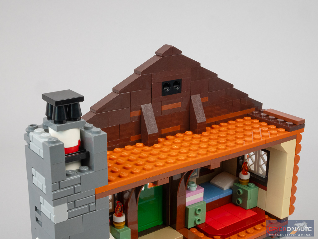 On élève ensuite la partie de mur visible sous les pans de la toiture couleur dark brown, qu’on décore sur l’extérieur grâce à quelques brackets. Une petite brique technic au centre servira à la fixation de la toiture. On termine la maçonnerie de la cheminée, puis on la couronne d’un petit sous-ensemble coulissant qui servira à allumer la brique lumineuse. On ajoute un lit, un tapis et quelques meubles côté intérieur, puis la structure à base de beams qui servira à fixer la toiture au-dessus de la chambre du 1er étage.