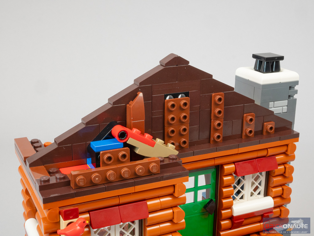 On s’occupe de la balustrade du balcon, puis on assemble les différents pans de toiture. Le plus petit prend place au-dessus de la chambre. Les deux plus grands sont ingénieusement fixés sur des beams pour trouver l’angle adéquat au niveau du 2ème étage. On pourra ensuite choisir de décorer le sapin assemblé en début de construction avec quelques boules, et on termine avec une belle enseigne clipsée sur le côté du bâtiment.