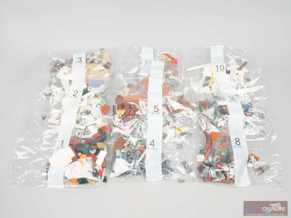 À l’intérieur de la boîte, on trouve 10 sachets de pièces numérotés, en plastique. Je me demande quand LEGO se décidera à nous fournir les sachets en papier promis il y a bien longtemps et toujours absents à quelques rares exceptions près. Il y a également deux notices d’instructions, on pourra donc partager la construction avec quelqu’un même si ce ne sera pas très équitable : la petite notice ne propose la construction que des petites constructions annexes, quand la plus grande est dédiée au chalet lui-même. Enfin, on trouve aussi une petite planche de 4 autocollants, rien de bien méchant.