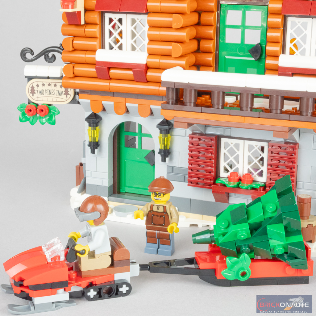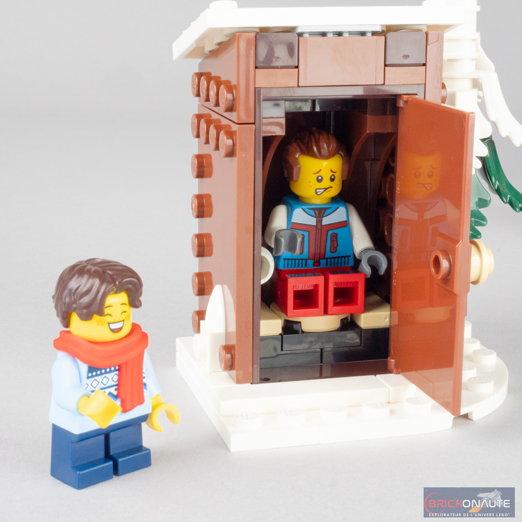 En cas d’envie pressante, il faudra par contre se rendre aux toilettes extérieures – un détail qui m’a fait sourire lorsque j’ai découvert les premières images de ce set, même s’il semble peu réaliste dans un logement de standing. Du côté des constructions « accessoires », LEGO nous propose également un morceau de lac gelé (et ses panels bleus scintillants pour la glace, c’est très joli) avec son stand de location de patins, et une motoneige avec un traîneau ramenant le sapin fraîchement coupé. Petite précision si ce n’est pas clair : il s’agit du même sapin que celui disposé à l’intérieur du chalet, qu’on pourra décorer en fin de construction. Toujours pour parler de végétation, remarquez aussi les jolis sapins couverts de neige, réalisés avec des feuilles superposées « à l’envers ».